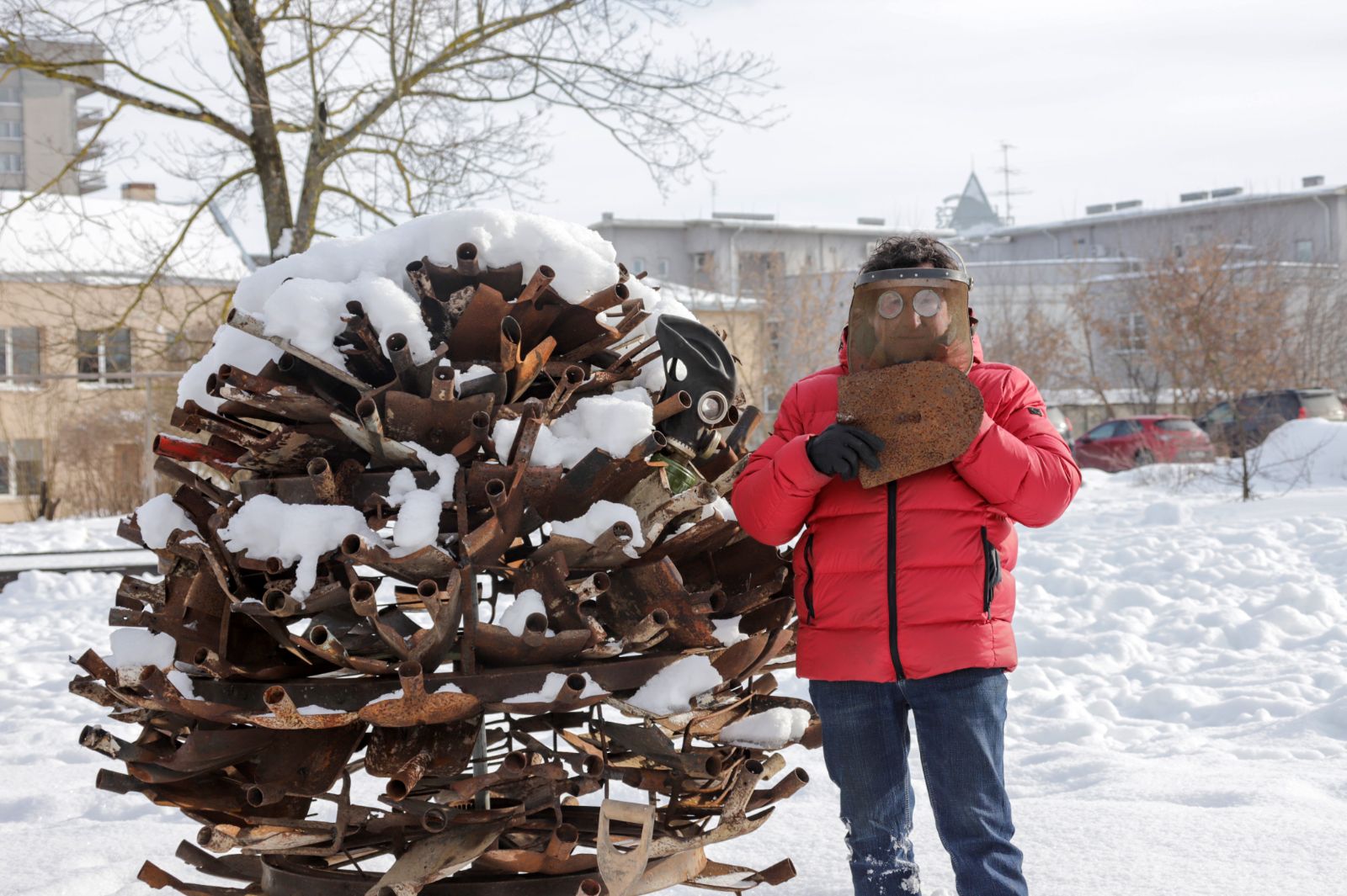 „Kastuvas atrodys kaip žmogaus veidas, kurį dengia dujokaukė. Mano idėja – pavaizduoti 2020–2021, o gal ir 2022 metus, nes nežinia, ar pandemija šiemet baigsis. Instaliacijos tema – visomis prasmėmis dūstantis pasaulis“, – pasakojo panevėžietis.