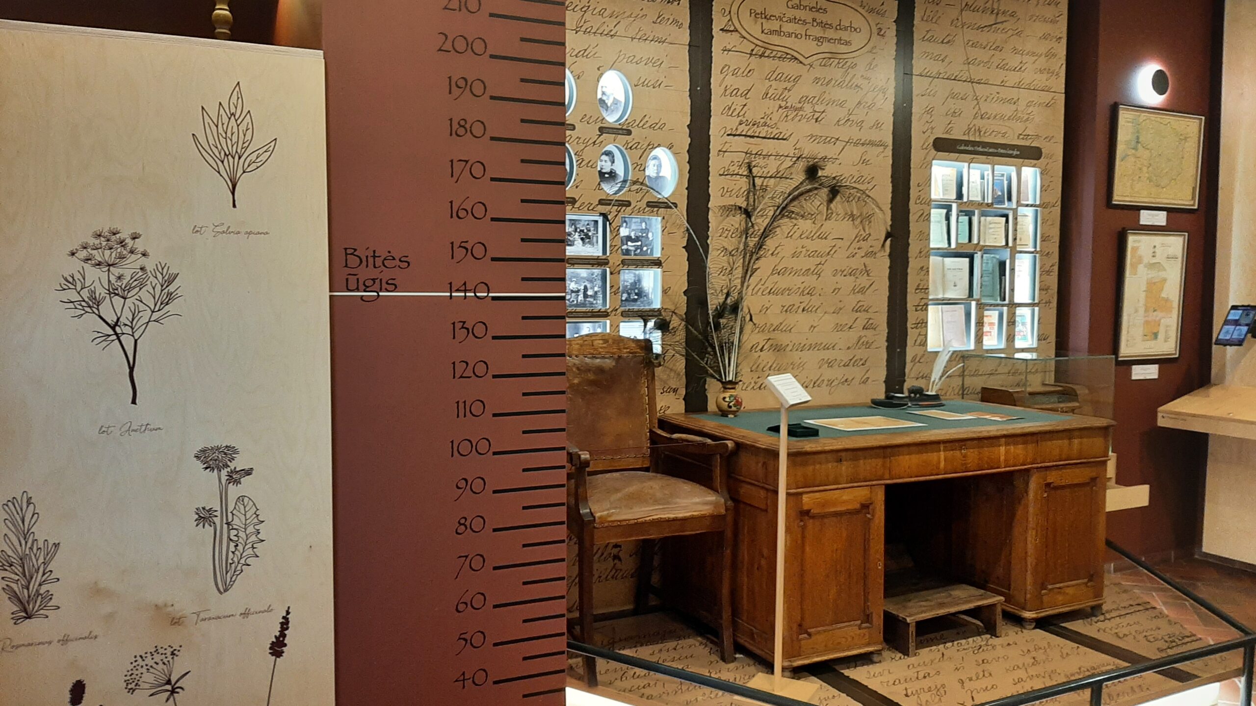 Šie G. Betkevičaitės-Bitės nuopelnai ekspozicijos kambario sienoje surašyti vienas virš kito. Kitoje vietoje įrašytas ir negalią turėjusios Bitės, save apibūdindavusios kaip luošę, kuriai nėra kada ilsėtis, ūgis. Jis – 1,42 metro. Tad bibliotekininkės, kurios šiame aruodų kambaryje ves edukacijas, siūlys jų dalyviams palyginti savo ūgį su Bitės ūgiu, o drauge pasilyginti su jos nuopelnais. Vidutinio ūgio žmogus, stojęs prie šios nuopelnų skalės, turėtų pamatyti, kad jis – visuomenininkas. Mažesni atsidurs kitame nuopelnų skalės lygyje.