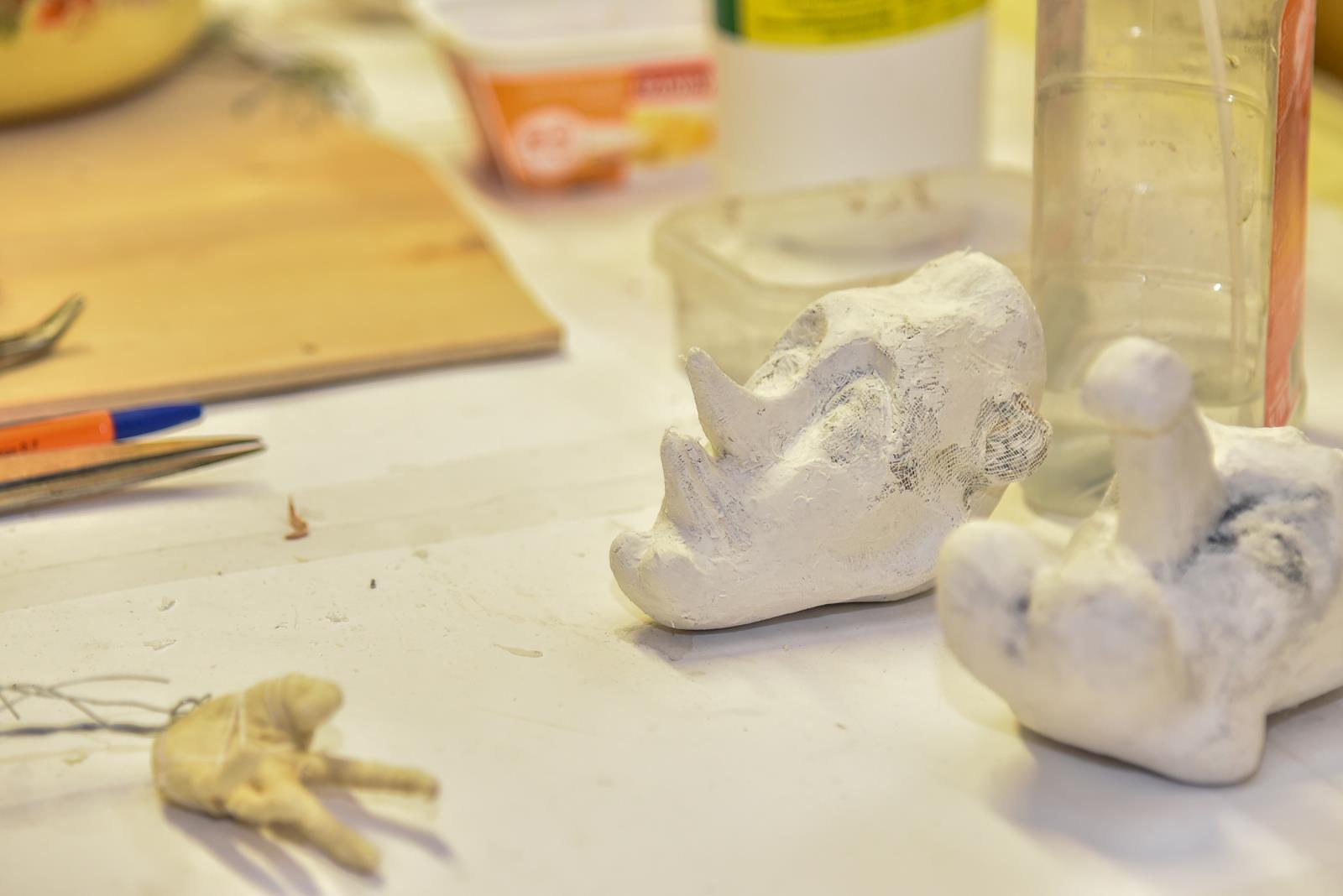 Visą pokalbio laiką dailininkai nepaleidžia iš rankų savųjų darbų – Oksana meistrauja plaštakas būsimo spektaklio veikėjams – lėlėms. Ant vielinio karkaso sluoksnis po sluoksnio vyniojama medžiaga, tepami klijai, daromi piršteliai.