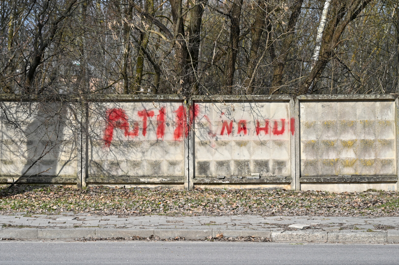 Tas pats šūkis su koordinatėmis rusų karo laivui tebežymi gelžbetonio tvorą J. Biliūno gatvėje. Už jos kitados, sovietmečiu, buvo lėktuvų variklių remonto dirbtuvės, dabar čia įsikūrusios įvairios įmonės.