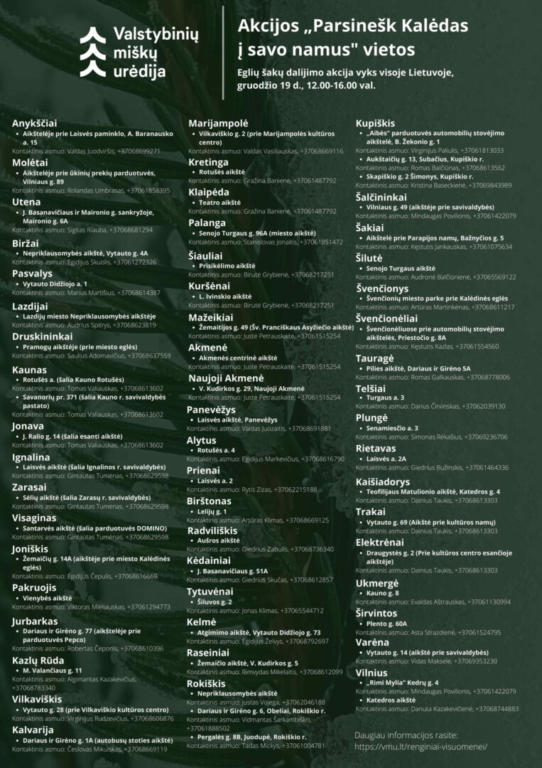 Gruodžio 19 d. 12.00-16.00 val. Valstybinių miškų urėdijos miškininkai pagrindinėse miestų ir miestelių aikštėse bei didžiųjų prekybos centrų aikštelėse visoje Lietuvoje gražiausioms metų šventėms besiruošiantiems gyventojams dovanos eglių ir pušų šakas. Šiemet eglišakių dalijimo vietų visoje Lietuvoje – daugiau nei 50.