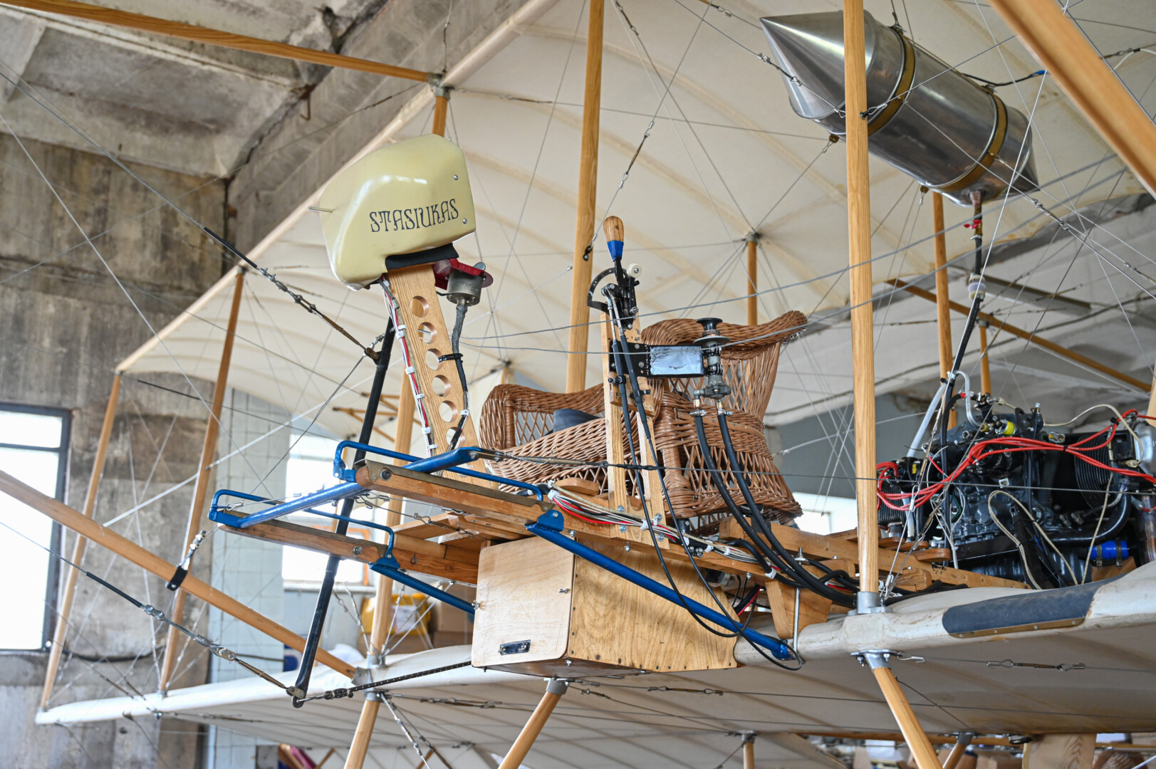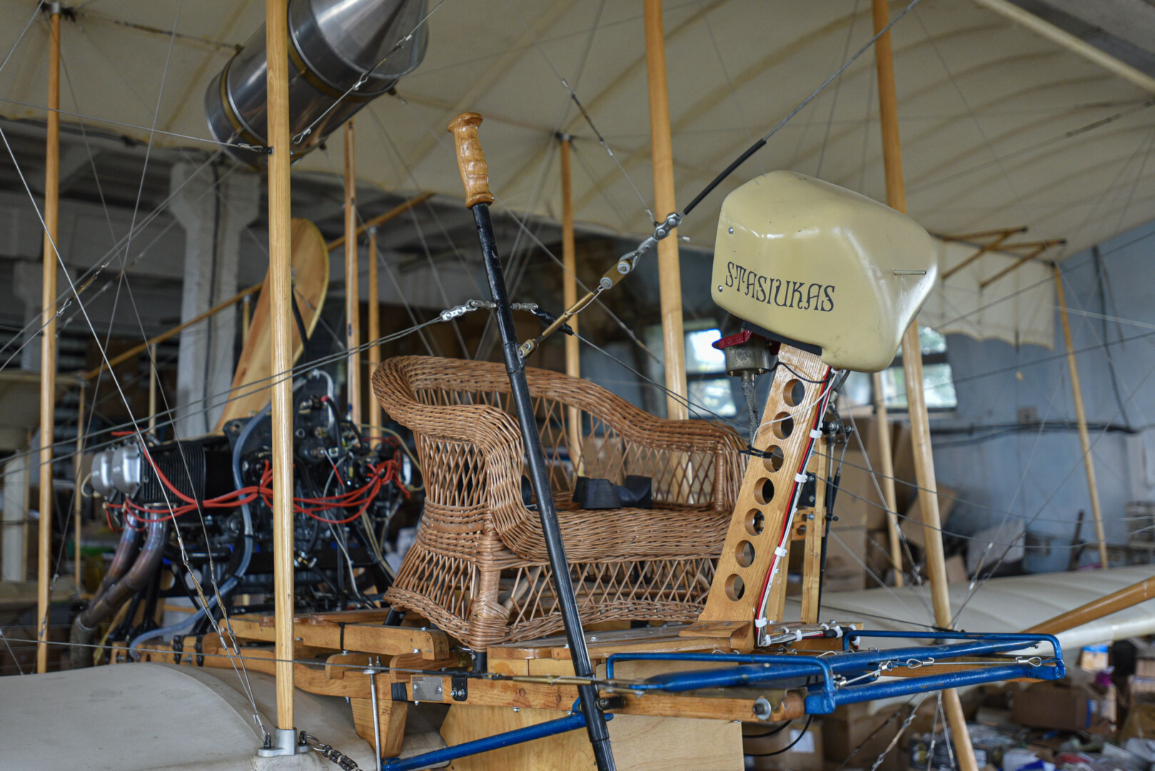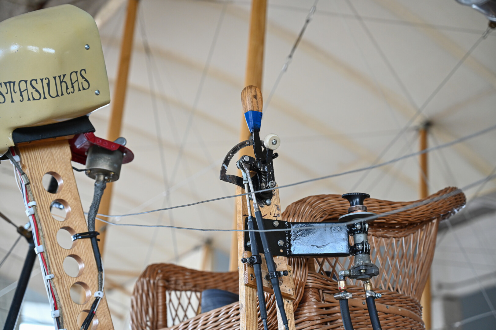 Autentiška liko ir piloto kėdė – ją iš vytelių nupynė Kauno tautodailininkai. Vienintelė šiuolaikinė technologija – prietaisų skydelis, padedantis lakūnui orientuotis danguje.
