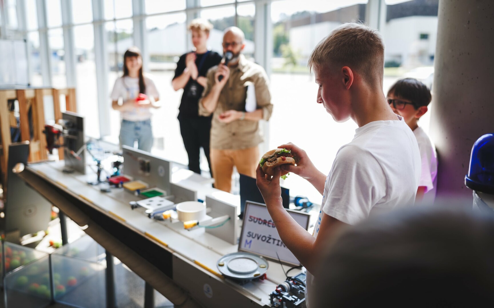 Panevėžio robotikos centro „RoboLabas“ komanda – Modestas Raila, Erikas Brazdžionis ir dvi mokinius kuruojančios pedagogės – sukonstravo nuotaikingą instaliaciją, kuri netikėtais ryšiais sujungia, atrodytų, mažai susijusias sritis – inžineriją ir kulinariją.