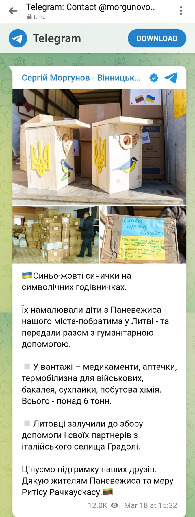 Į pagalbos rinkimą lietuviai įtraukė savo partnerius iš Italijos Gradoli miesto. Dėkojame už mūsų draugų palaikymą. Ačiū panevėžiečiams ir merui Ryčiui Račkauskui“, – platformoje „Telegram“ paskelbė Vinycios miesto meras Sergejus Morgunovas.