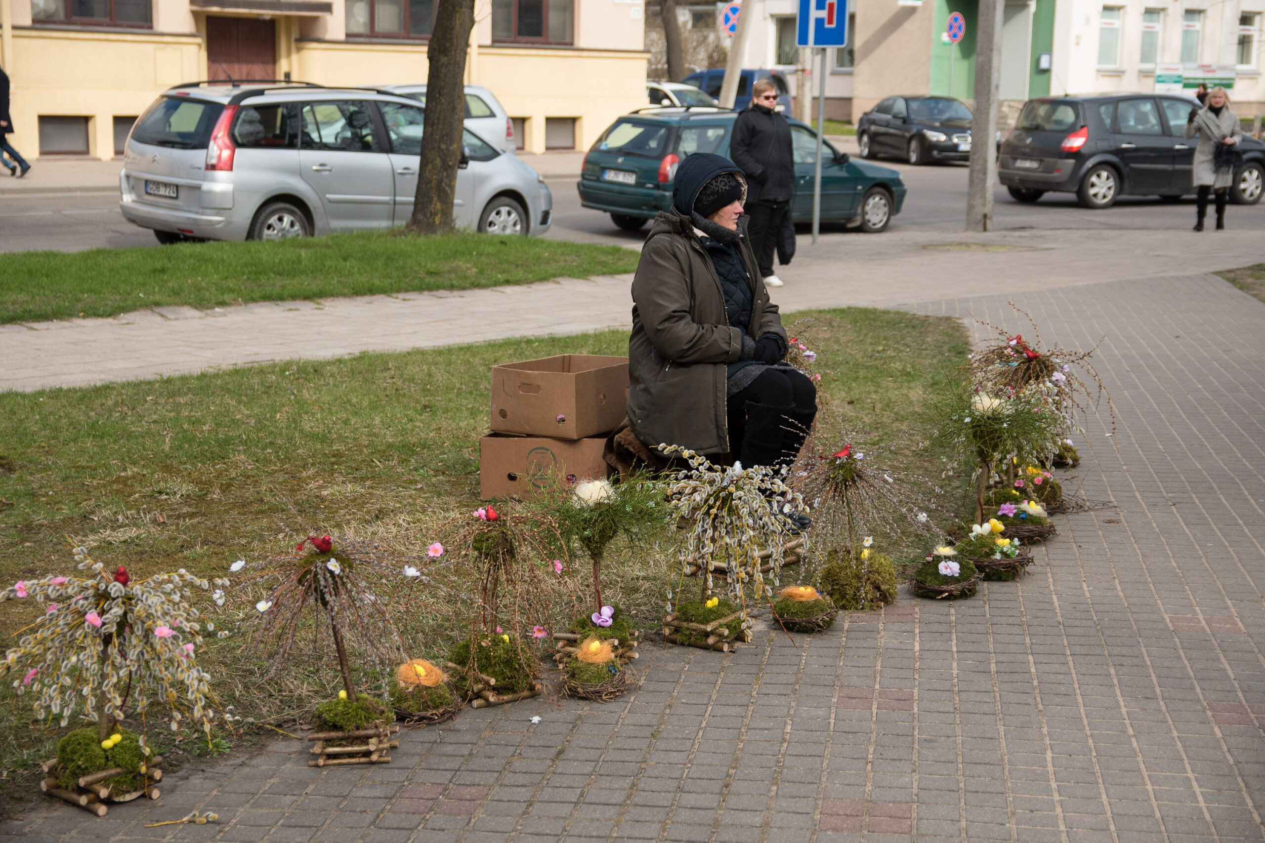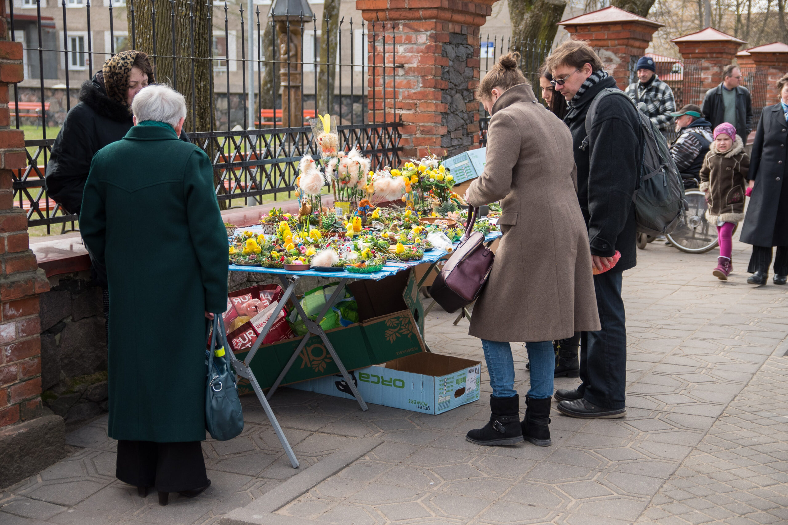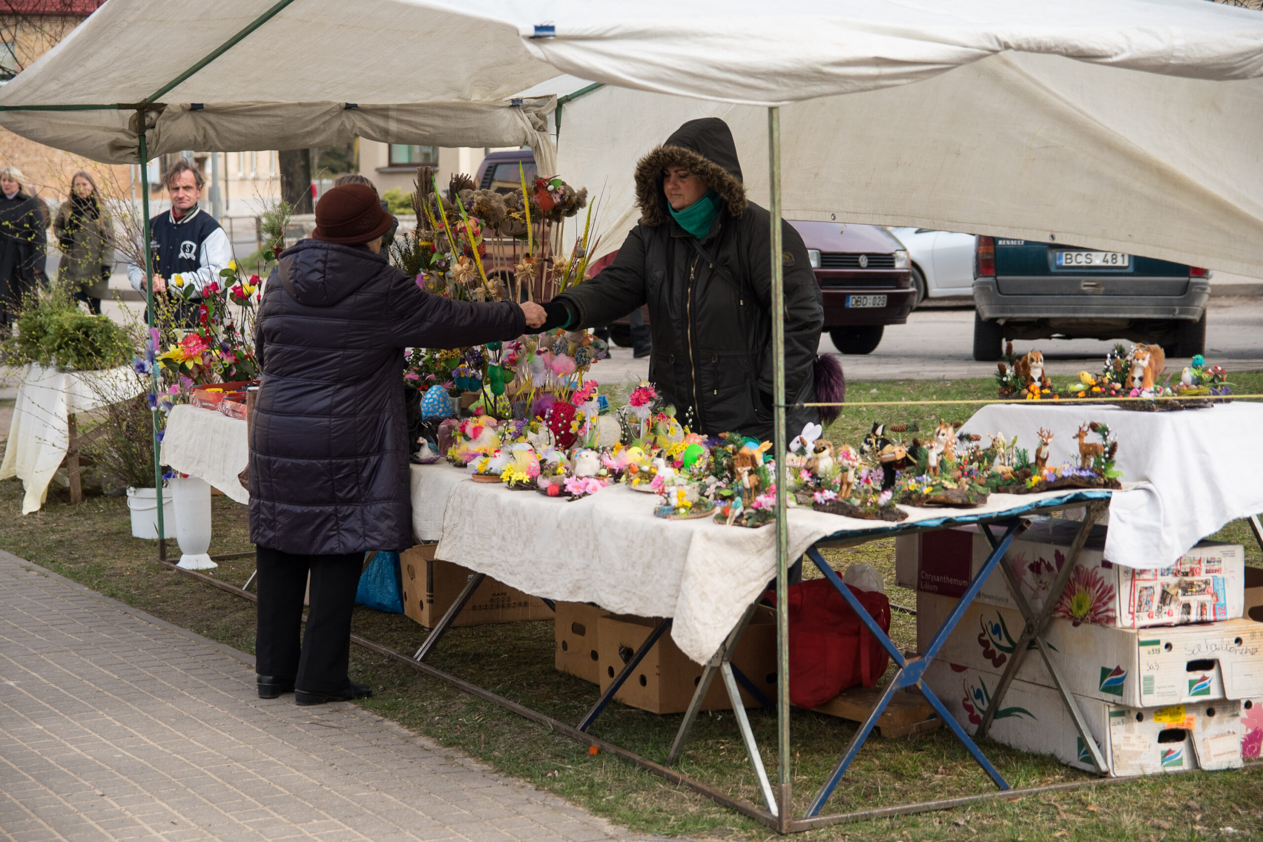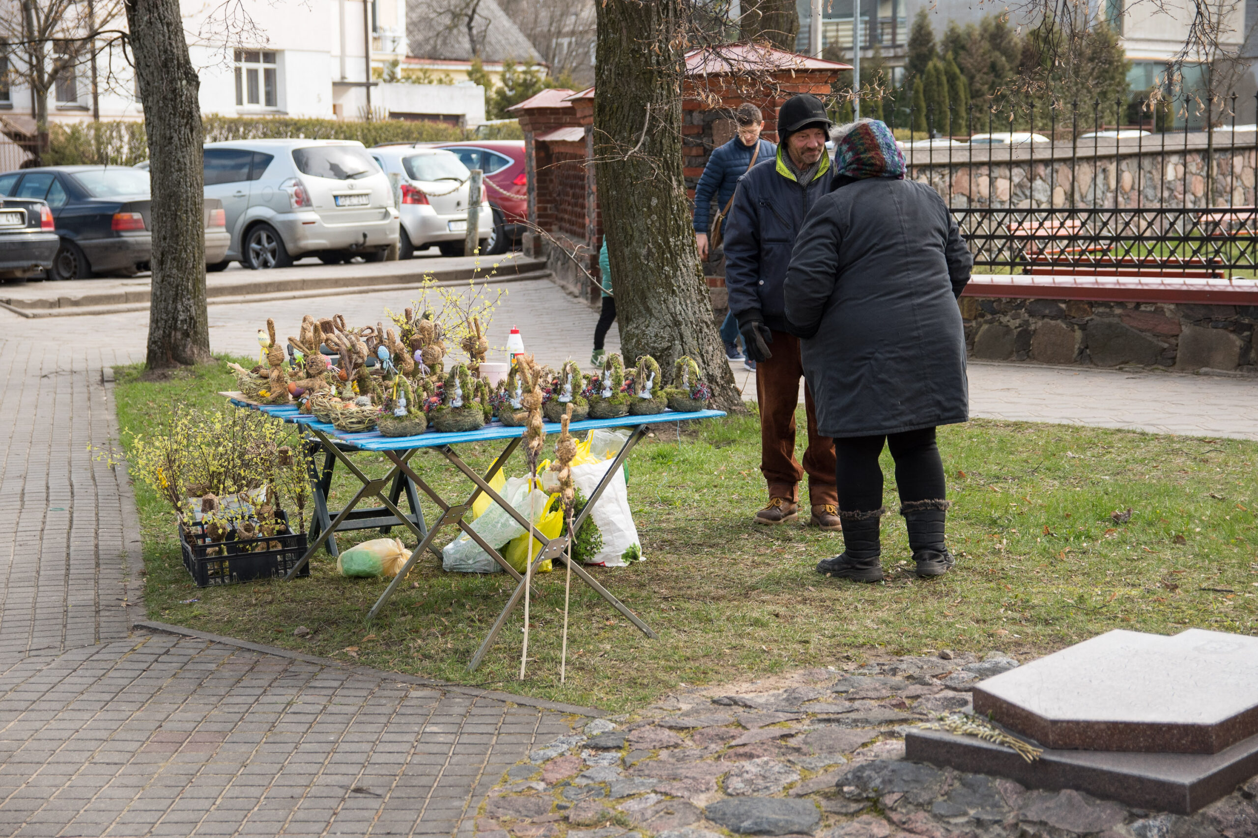 Įvairiais velykiniais dirbiniais prekiavusi Irena Kriauzienė prekyba per daug nesiskundė. Žmonės pirko įvairias rankų darbo velykines puokšteles, kitus darbelius. Nors oras nelepino, ji nesiskundė – tik rankoms buvo šalta, tačiau norisi nors  šiek tiek prie pensijos prisidėti.