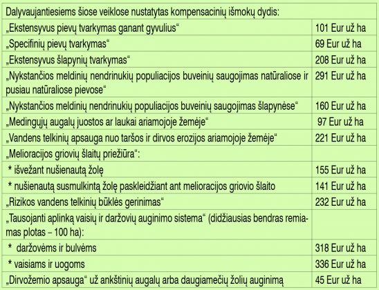 Atsižvelgiant į atskirų veiklų aktualumą, numatyti skirtingi paramos dydžiai kiekvienai iš jų. Viena iš didžiausių paramų, diegiant tausojančią aplinką vaisių ir daržovių auginimo sistemą, kompensacinė išmoka daržovėms ir bulvėms – 318 Eur už ha, vaisiams ir uogoms – 336 Eur už ha. Jeigu bus gerinama rizikos vandens telkinių būklė, parama siektų 232 Eur už ha.