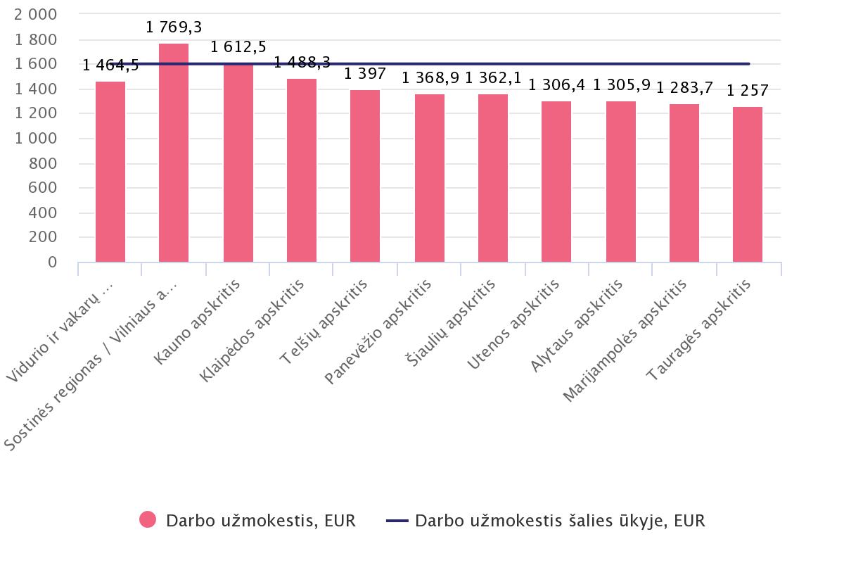 Vidutinis mėnesinis bruto darbo užmokestis šalies ūkyje (be individualiųjų įmonių) 2021 m. trečiąjį ketvirtį sostinės regione buvo 1 769,3 eurų ir, palyginti su 2021 m. antruoju ketvirčiu, padidėjo 1,5 proc. Vidurio ir vakarų Lietuvos regione bruto darbo užmokestis buvo 1 464,5 eurų ir per ketvirtį išaugo 2,5 proc.