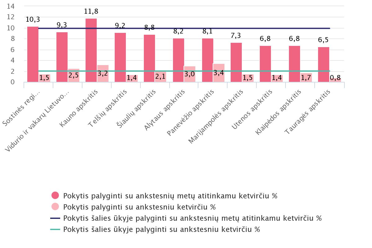 Bruto darbo užmokesčio atotrūkis tarp šių regionų 2021 m. trečiąjį ketvirtį sudarė 304,8 eurų ir per ketvirtį sumažėjo 10 eurų. Vidutinis mėnesinis bruto darbo užmokestis šalies ūkyje per ketvirtį išaugo visose apskrityse – nuo 0,8 proc. Tauragės iki 3,4 proc. Panevėžio. Didžiausią – 1 769,3 eurų – bruto darbo užmokestį gavo Vilniaus apskrities įmonių, įstaigų ir organizacijų darbuotojai. Mažiausiai – 1 257 eurų – uždirbo Tauragės apskrities darbuotojai. Vidutinis mėnesinis neto darbo užmokestis per ketvirtį išaugo visose apskrityse nuo 0,7 iki 3 proc. Atlyginimai pagal regionus© Statistikos departamento nuotr. Darbo užmokesčio pokyčiams 2021 m. trečiąjį ketvirtį įtakos turėjo sustabdytos veiklos dėl COVID-19 infekcijos atnaujinimas, didesnis darbo dienų skaičius, sezoniniai svyravimai ir kitos priežastys.