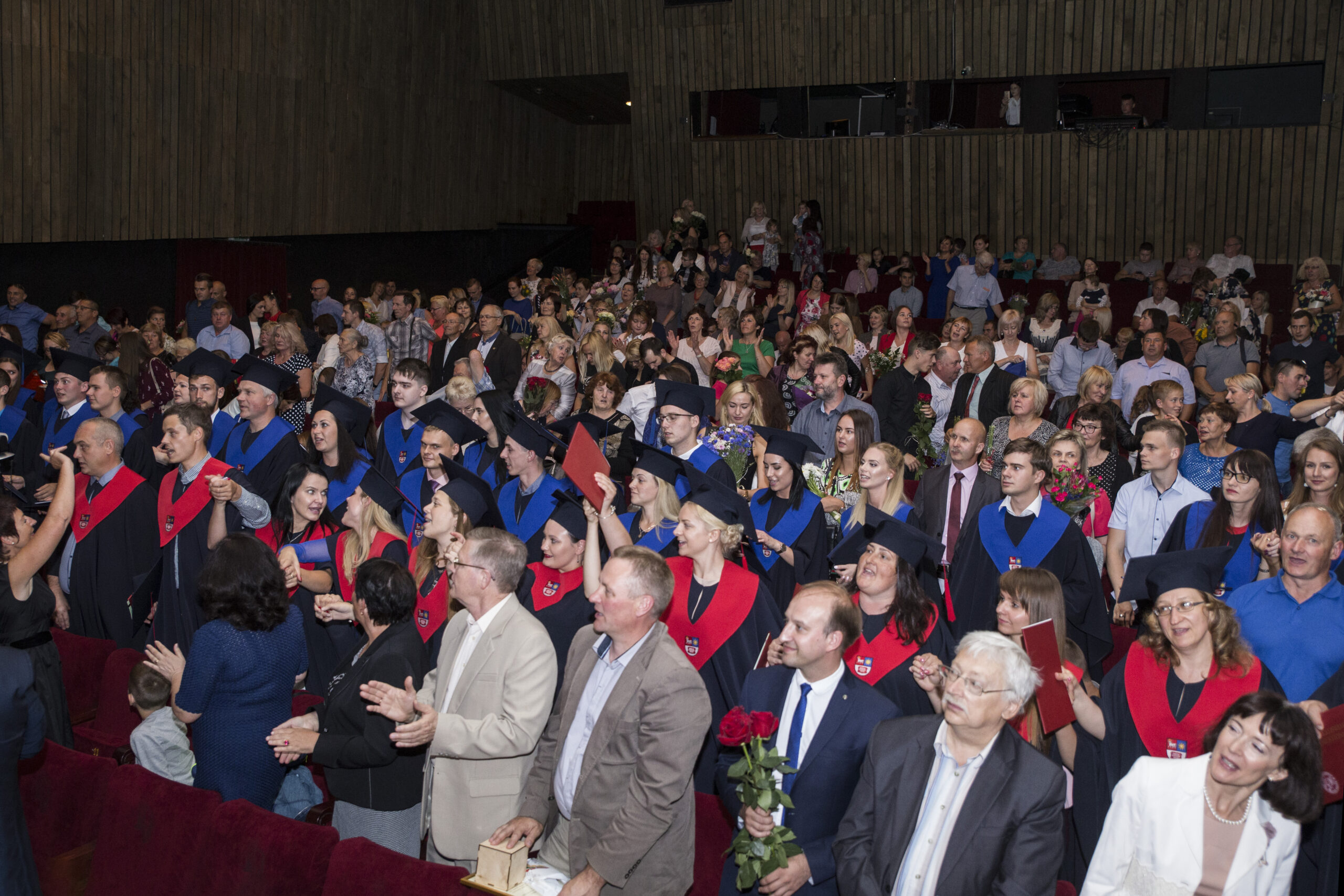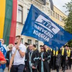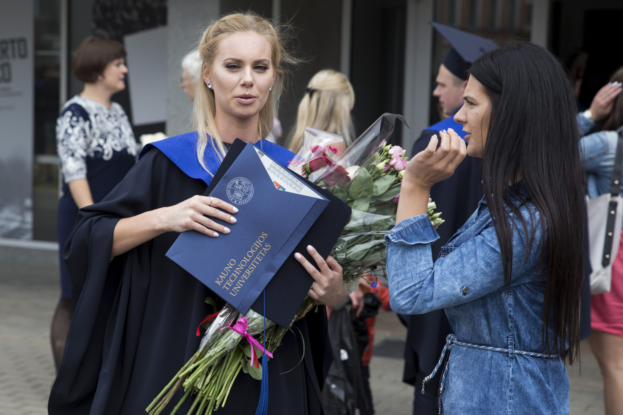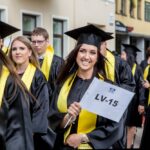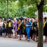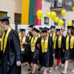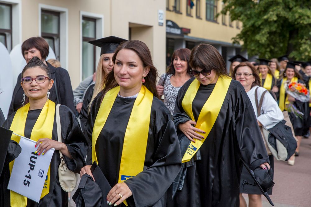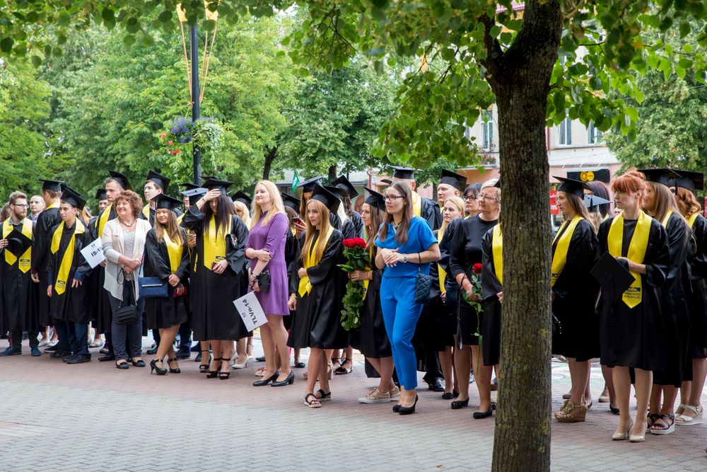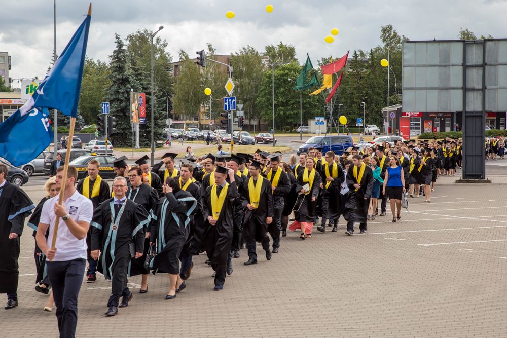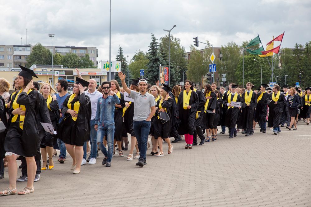 Skambi muzika mantijomis pasipuošusią minią lydėjo ir Klaipėdos-Nemuno gatvėmis link miesto arenos. Joje surengta iškilminga diplomų įteikimo ceremonija.