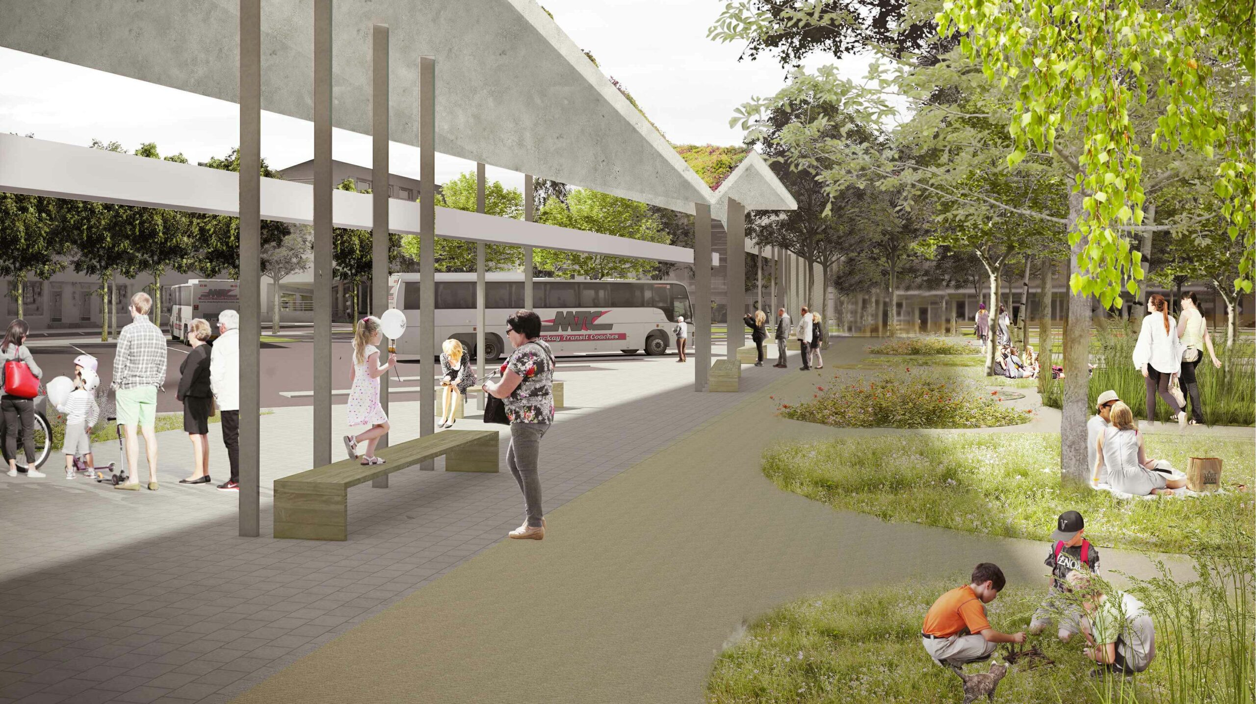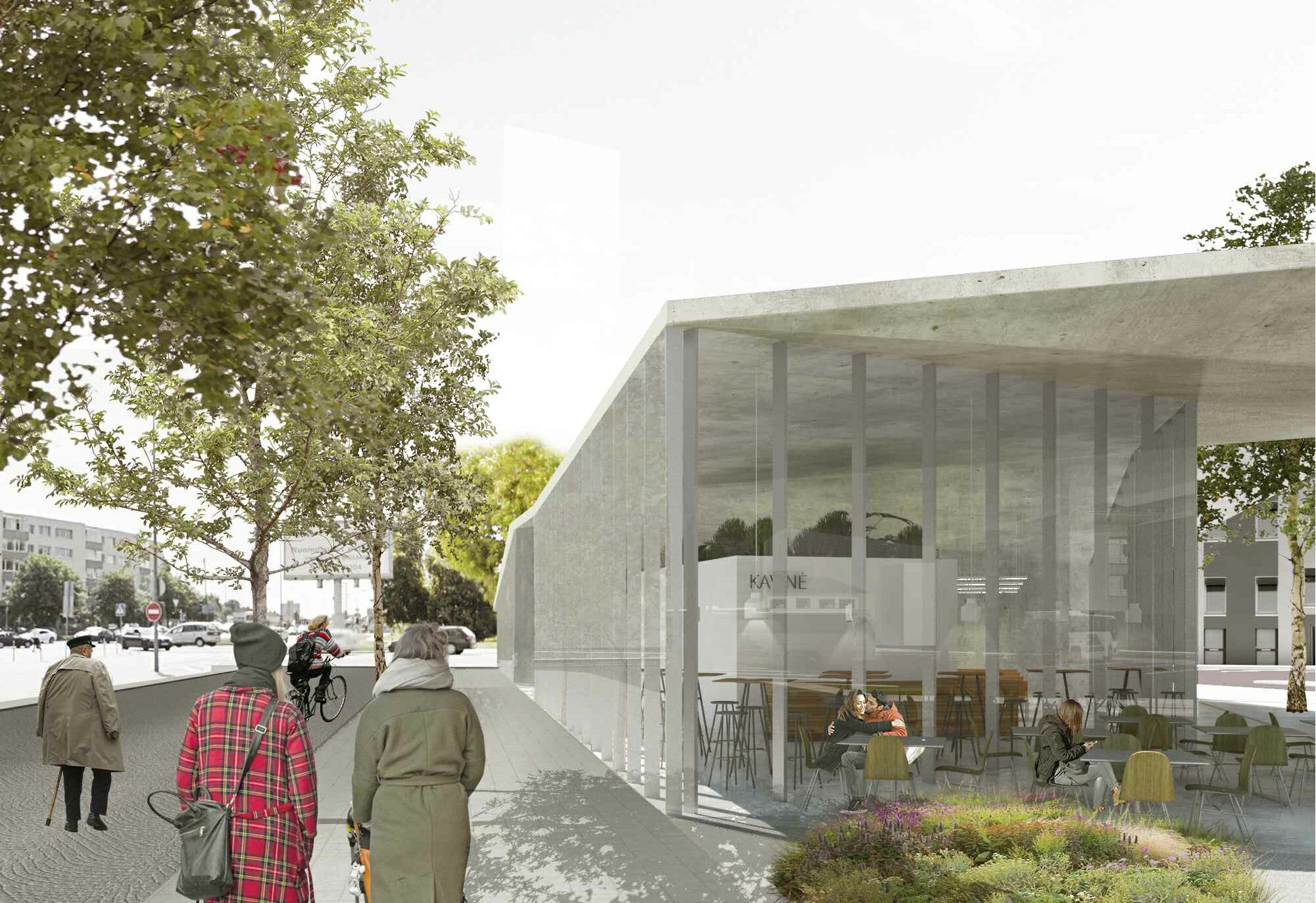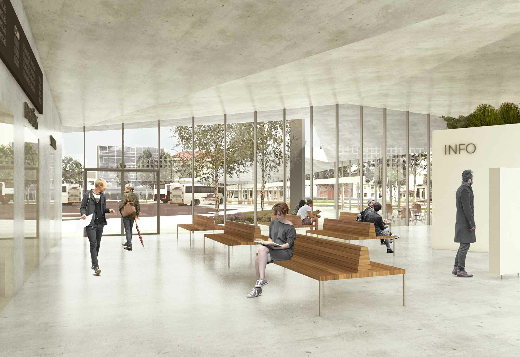 Autobusų stoties pastatas suprojektuotas netaisyklingos trapecijos formos. Fasadai numatyti skaidraus stiklo, užtikrinantys vizualinius ryšius tarp vidaus erdvių ir lauke esančio perono, ši vieta kuo daugiau pritaikyta pėstiesiems. Autobusų stotį numatyta įrengti su keleivių laukiamąja sale, bilietų kasomis, vairuotojų poilsio kambariu, bagažo ir smulkių siuntų skyriumi, dispečerine, informacijos tarnyba, sanitarinėmis, administracinėmis patalpomis bei kt.