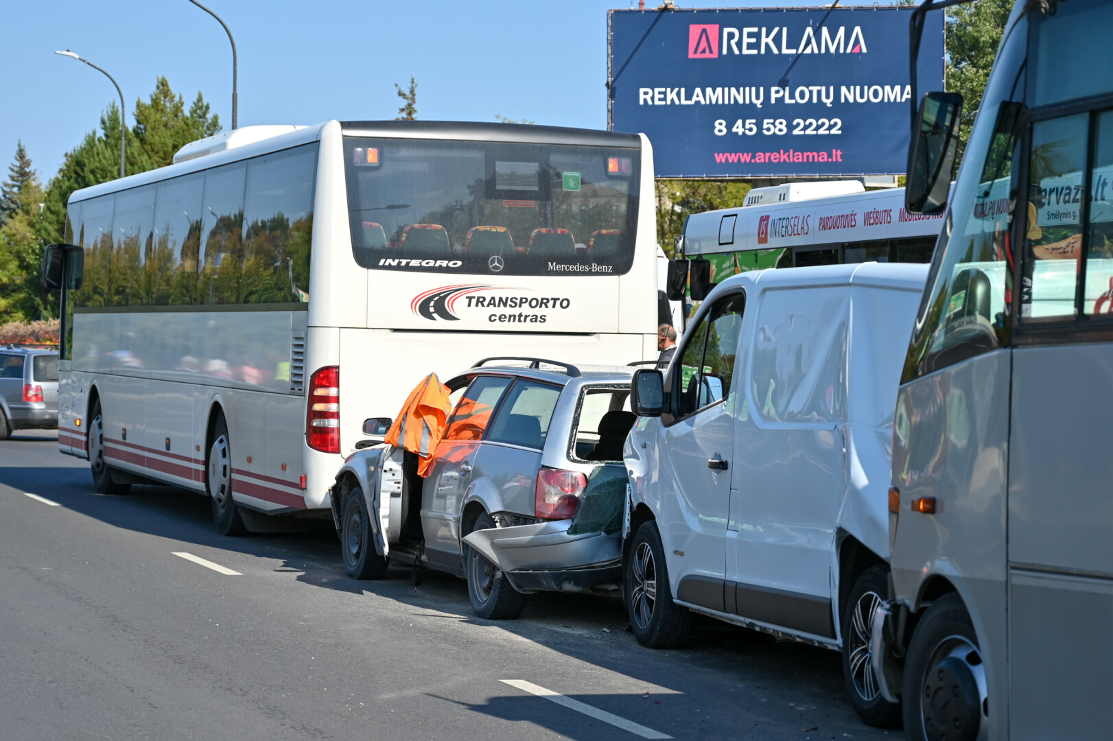 Automobiliai avarijos metu atsidūrė tarp dviejų autobusų.