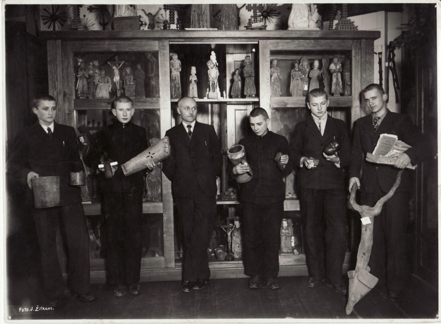 Jono Žitkaus fotografijoje užfiksuoti ne tik gimnazistai, Gimtajam kraštui tirti draugijos nariai, su 1934–1941 m. muziejui vadovavusiu Antanu Kasperavičiumi (1898–1963), bet už jų nugarų matyti muziejaus ekspozicinės spintos su medinėmis sakralinėmis skulptūrėlėmis.