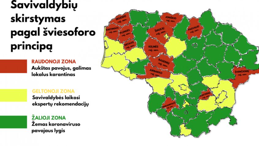 Geltonoji zona reikš, kad joje esančios savivaldybės, siekdamos suvaldyti tolimesnį koronaviruso plitimą, turėtų būti pasiruošusios bei atsakingai laikytis visuomenės sveikatos ekspertų rekomendacijų.