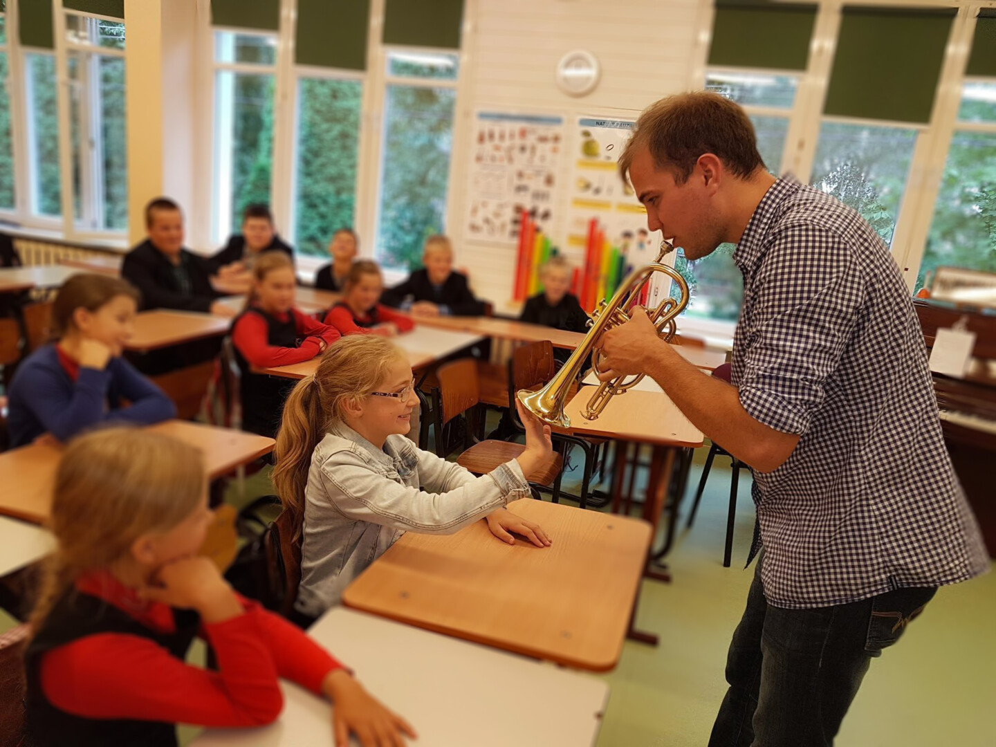 Jis papasakojo pradinukams apie varinių pučiamųjų instrumentų pasaulį, pats pagrojo su įvairiais instrumentais, leido ir mokiniams pabandyti išgauti pirmuosius garsus.