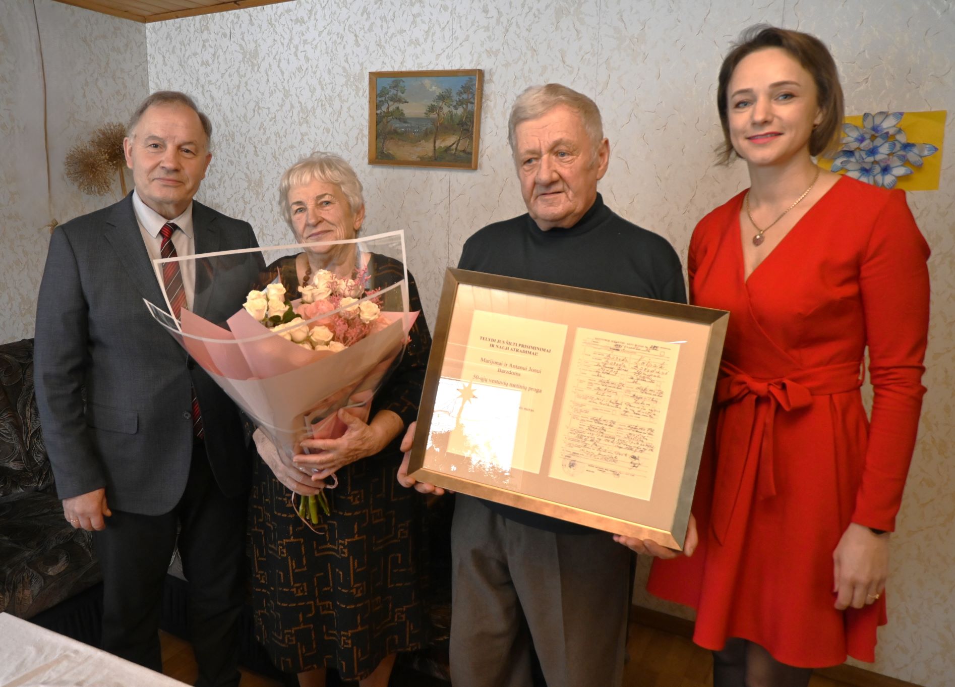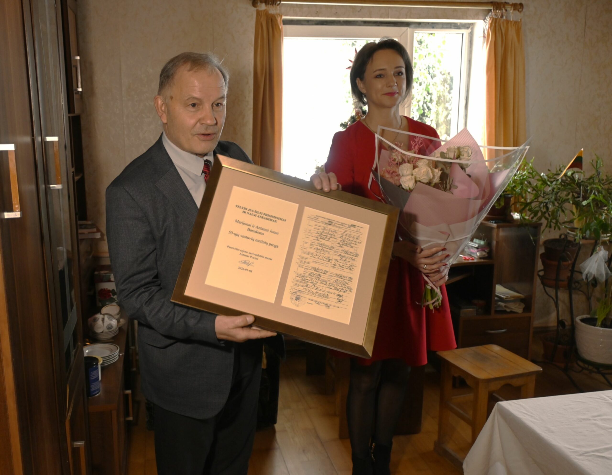 Tradiciškai sukaktuvininkus sveikinantis Panevėžio rajono savivaldybės meras kartu su Civilinės metrikacijos ir archyvų skyriaus vedėja Rūta Rude jubiliatams įteikė meniškai įrėmintas santuokos sudarymo įrašų kopijas.