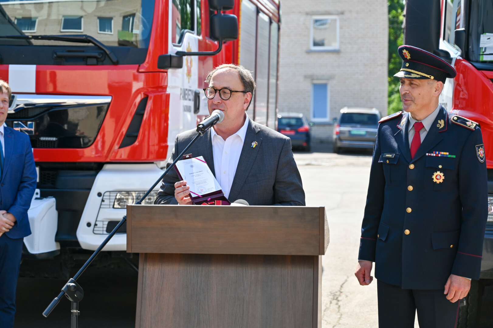 „Bet galime pasidžiaugti, kad toji technika pas mus atkeliavo iš Vokietijos, o tenykštės ugniagesių mašinos nuvažiavusios vos po 20 tūkstančių kilometrų. Žinau, kad ir patys vokiečiai juokauja, jog jų ugniagesių automobiliai dažniausiai pasitarnauja alui vežioti į ugniagesių šventes“, – ironizavo A. Blaževičius.