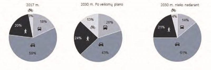 Iki 2030 metų neįgyvendinus darnaus judumo plane numatytų priemonių, pasak jo rengėjų, prognozuojama, jog kelionių privačiais lengvaisiais automobiliais dalis dar išaugtų net iki 61 proc. visų atliekamų kelionių ir tai būtų 18 proc. daugiau nei įgyvendinus planą.