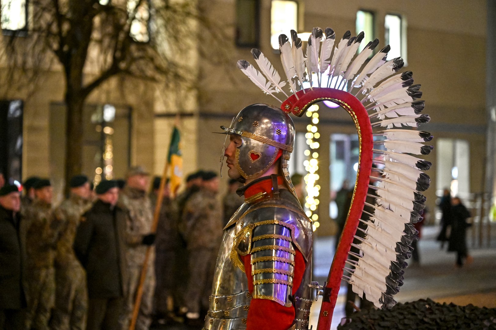 Prie Panevėžio miesto savivaldybės surengta iškilminga karių rikiuotė – ją papuošė XVI a. sparnuotojo husaro istoriniais sunkiosios kavalerijos šarvais ir Lietuvos nepriklausomybės kovų ketvirtojo pėstininkų pulko karininko autentiška 1919 m. uniformą vilkintys kariai.