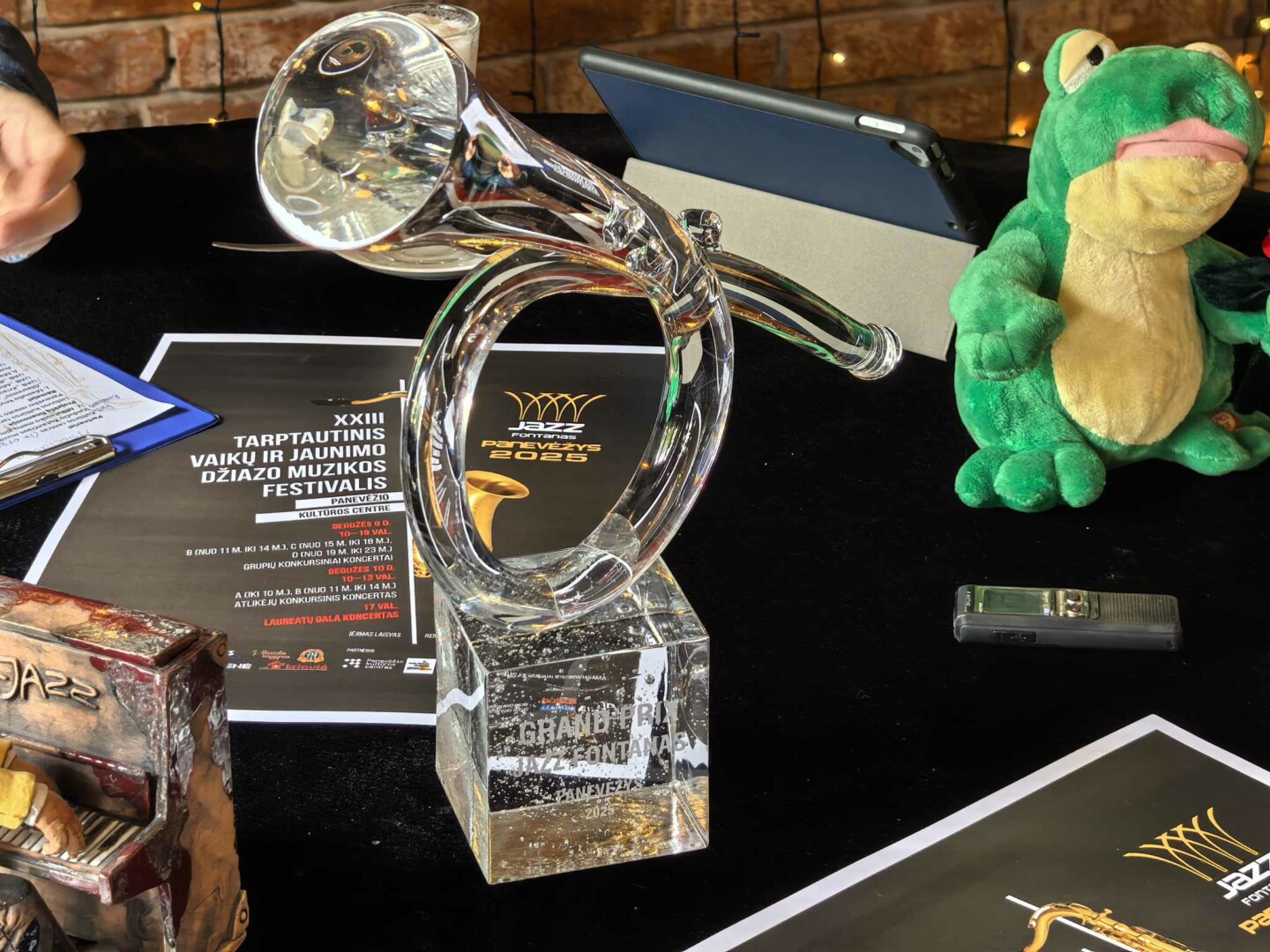 Pagrindinis festivalio prizas – panevėžiečio stiklo menininko Remigijaus Kriuko sukurtas įspūdingas stiklo trimitas.