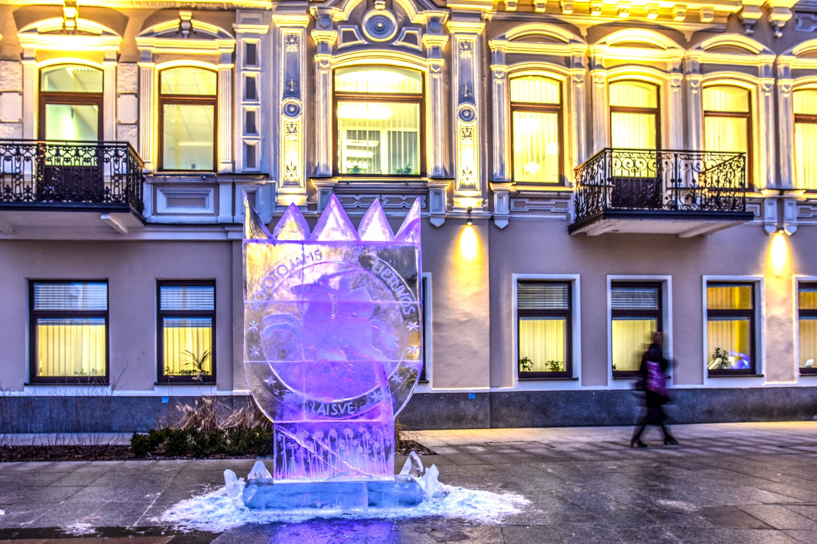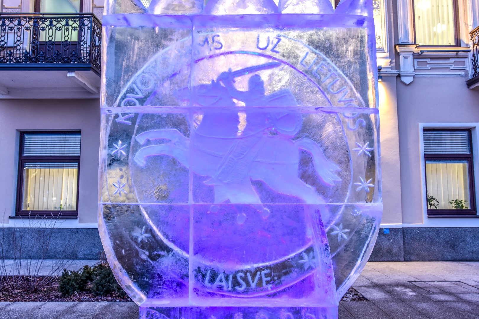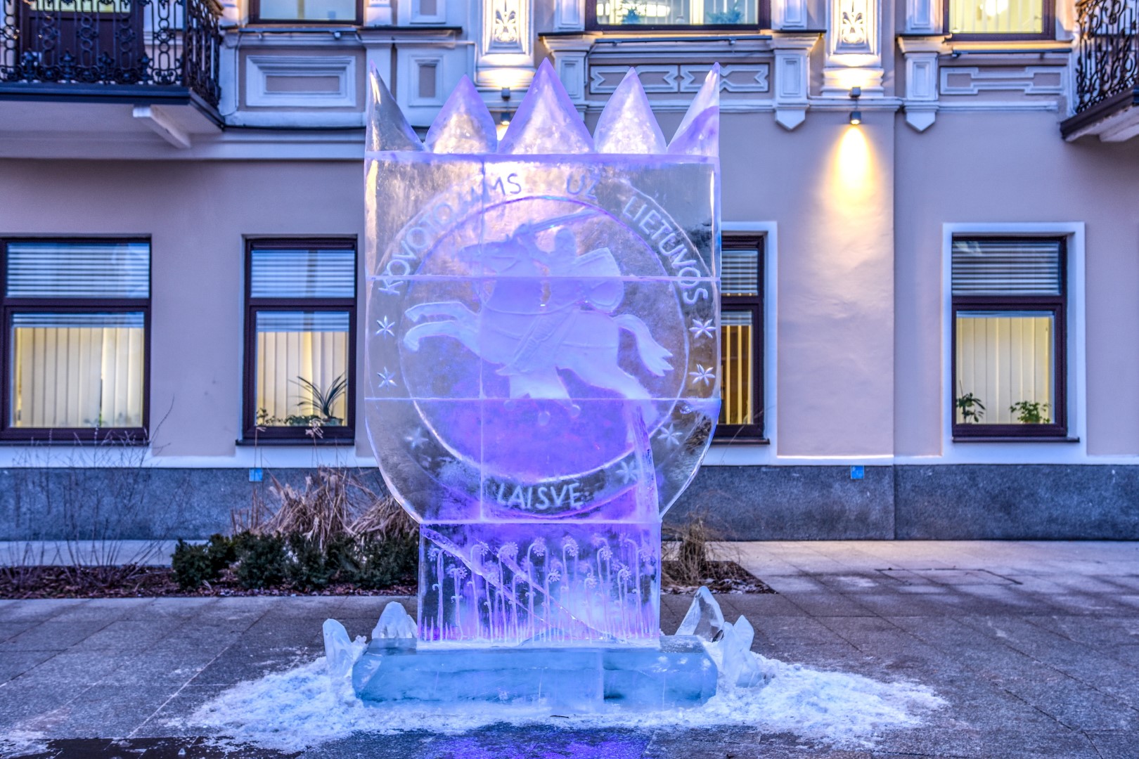 Laisvės dienos gynėjų išvakarėse Panevėžio širdyje, Laisvės aikštėje, nušvito įstabi brolių menininkų Kęstučio ir Vytauto Musteikių sukurta ledo skulptūra „Už Laisvę“.