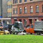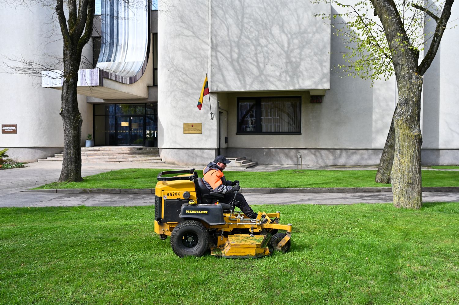 Miesto vejų ir žolynų priežiūrą atliekančios bendrovės „Panevėžio specialus autotransportas“ darbuotojai penktadienį žolę pjauna Nepriklausomybės a., P. Plechavičiaus skvere, taip pat šalia Panevėžio miesto santuokų rūmų.