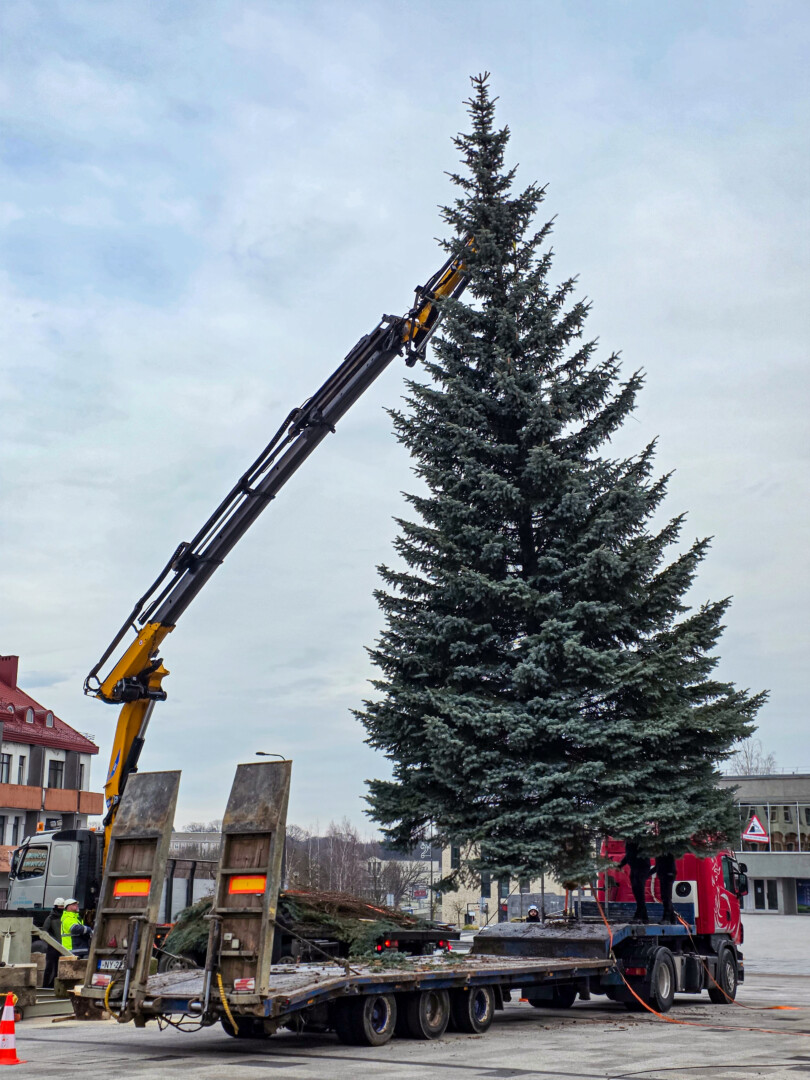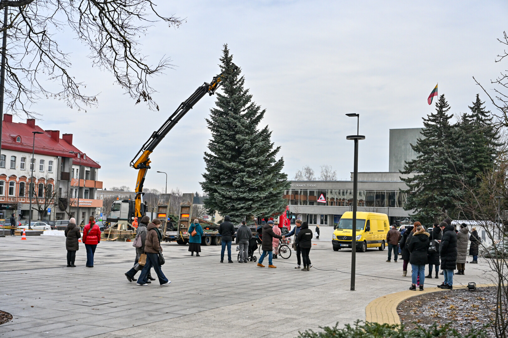 Pasak „GES projektai“ direktorės Erinijos Svarinskienės, nupjauti ne vieną toną sveriantį maždaug 15 metrų aukščio medį ir atgabenti į miesto centrą – sudėtinga užduotis.