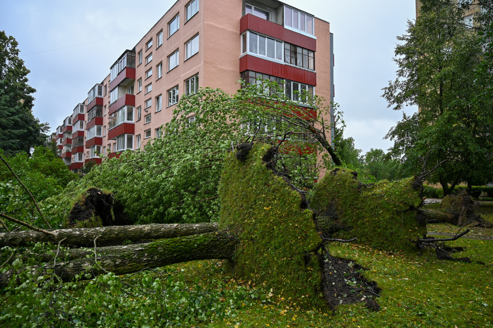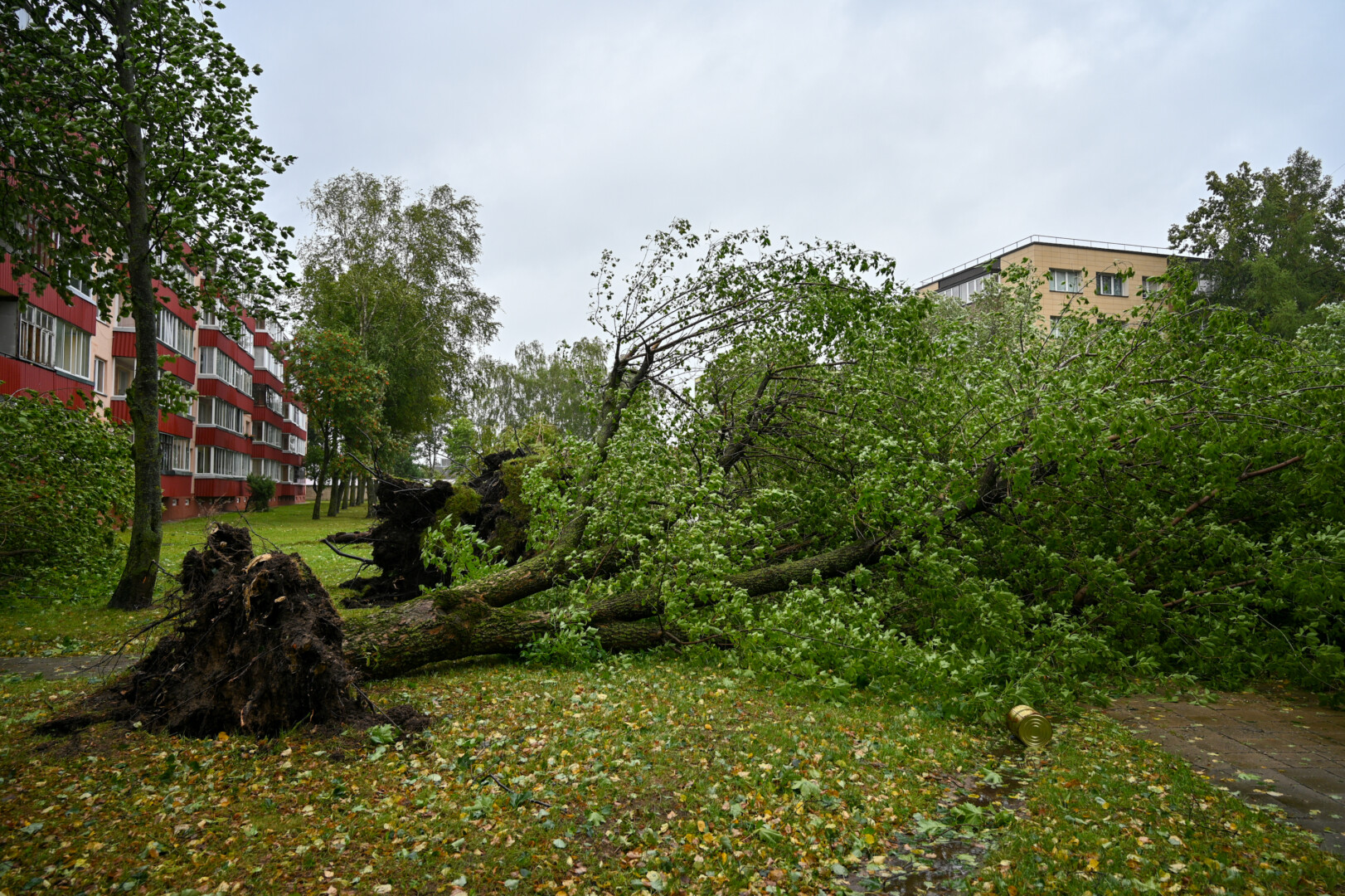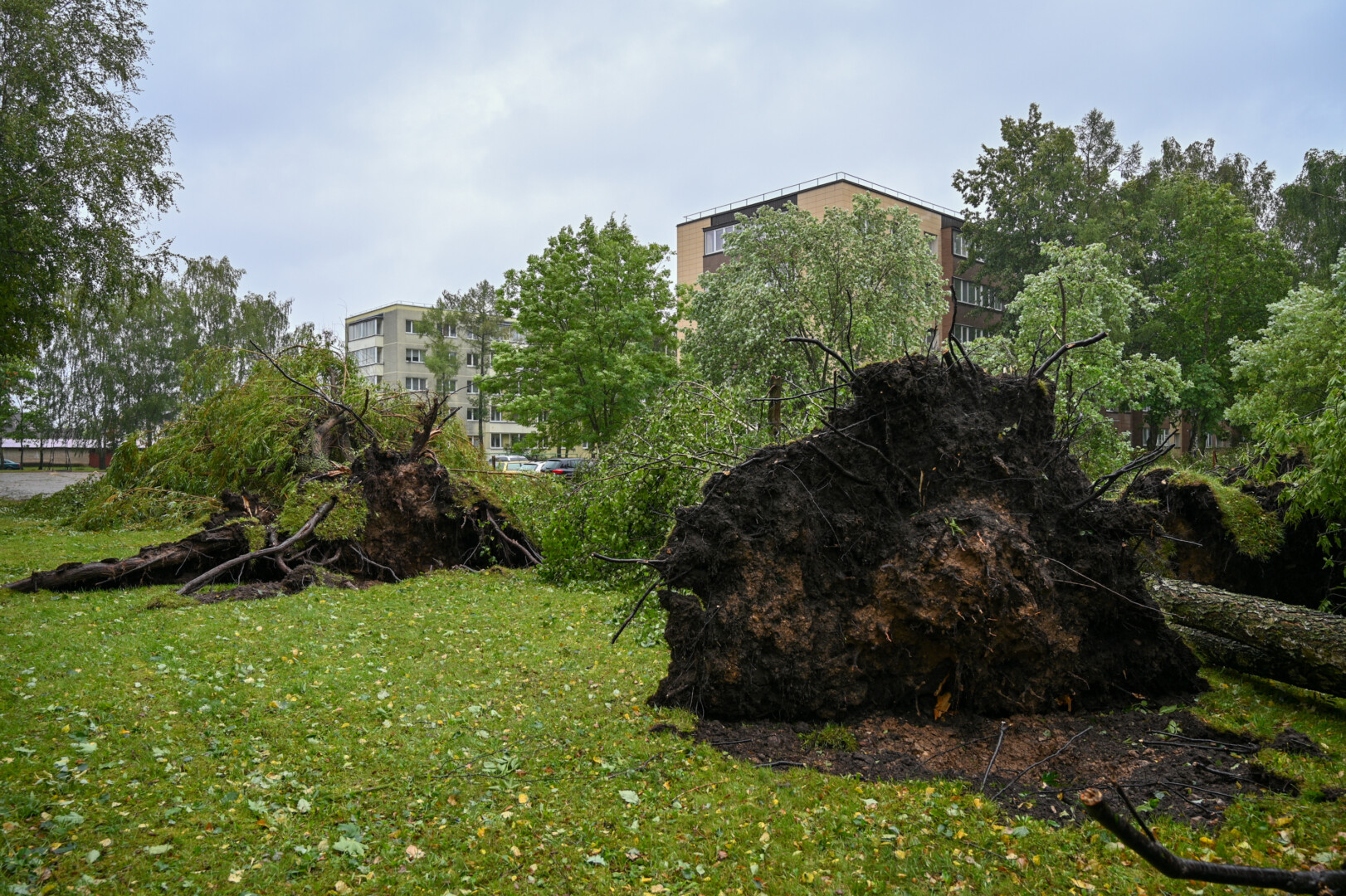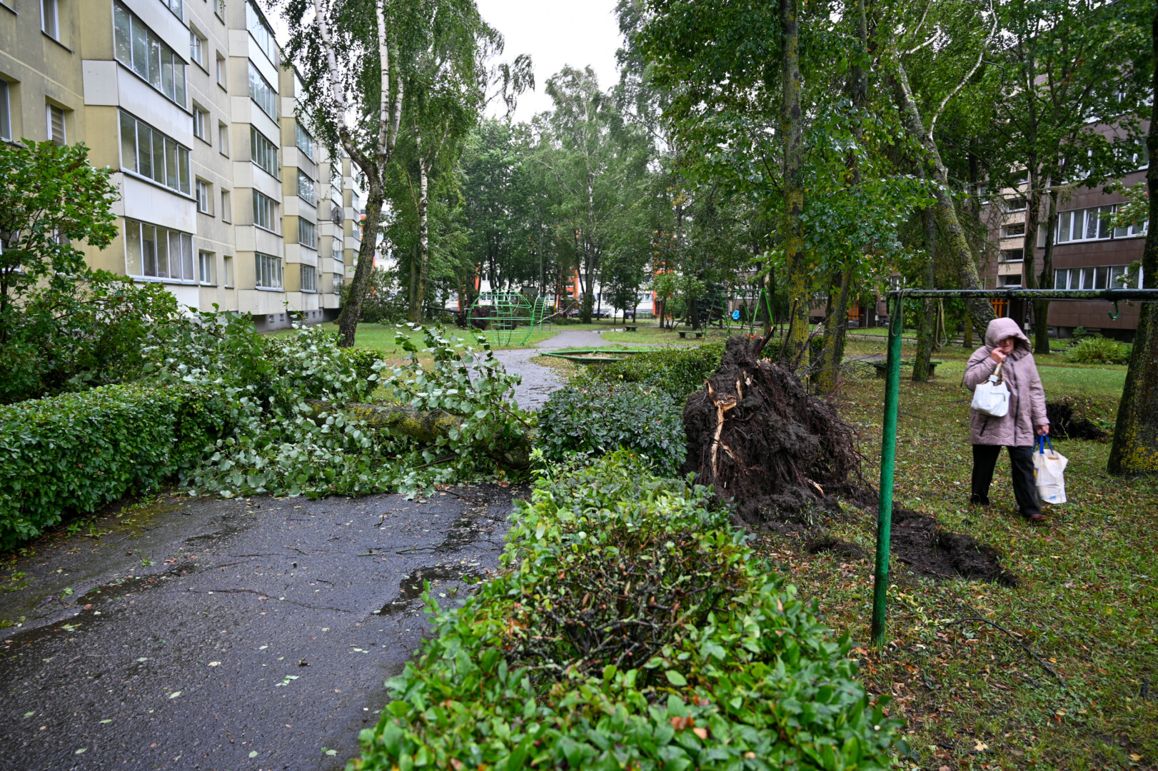 Panevėžyje vėjas ne tik laužė, bet ir rovė medžius. Didžiulė eglė išversta Sietyno skvere, naktį Tulpių g. 16-ojo daugiabučio kieme su šaknimis išversti net keturi didžiuliai medžiai, tarp jų – ir už penkiaaukštį aukštesnis beržas.