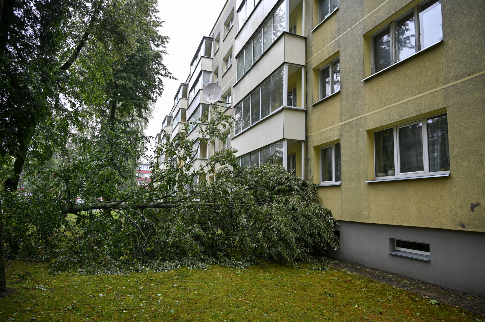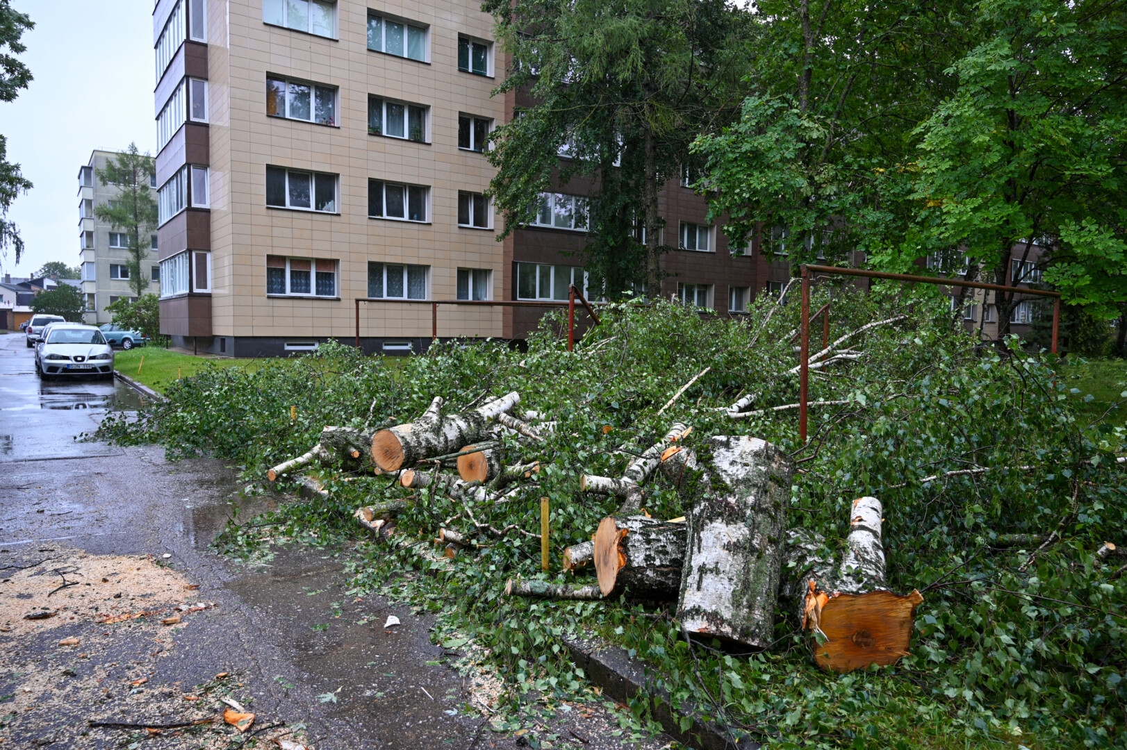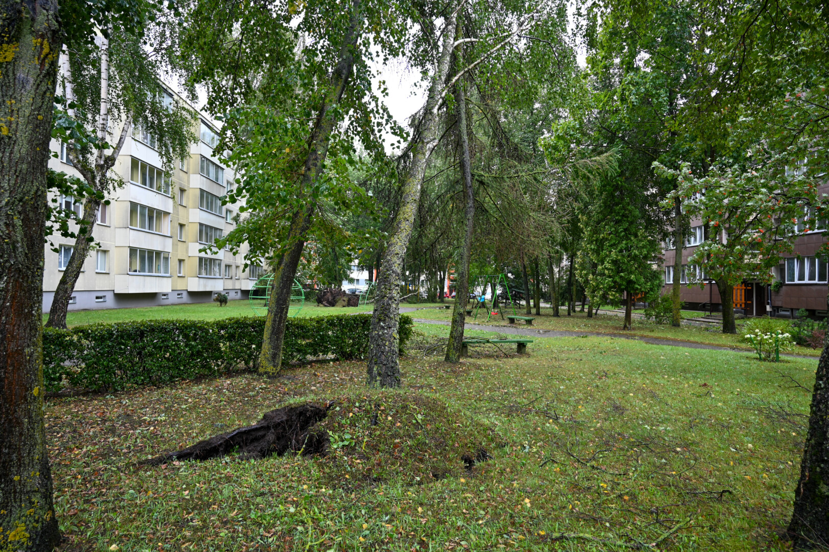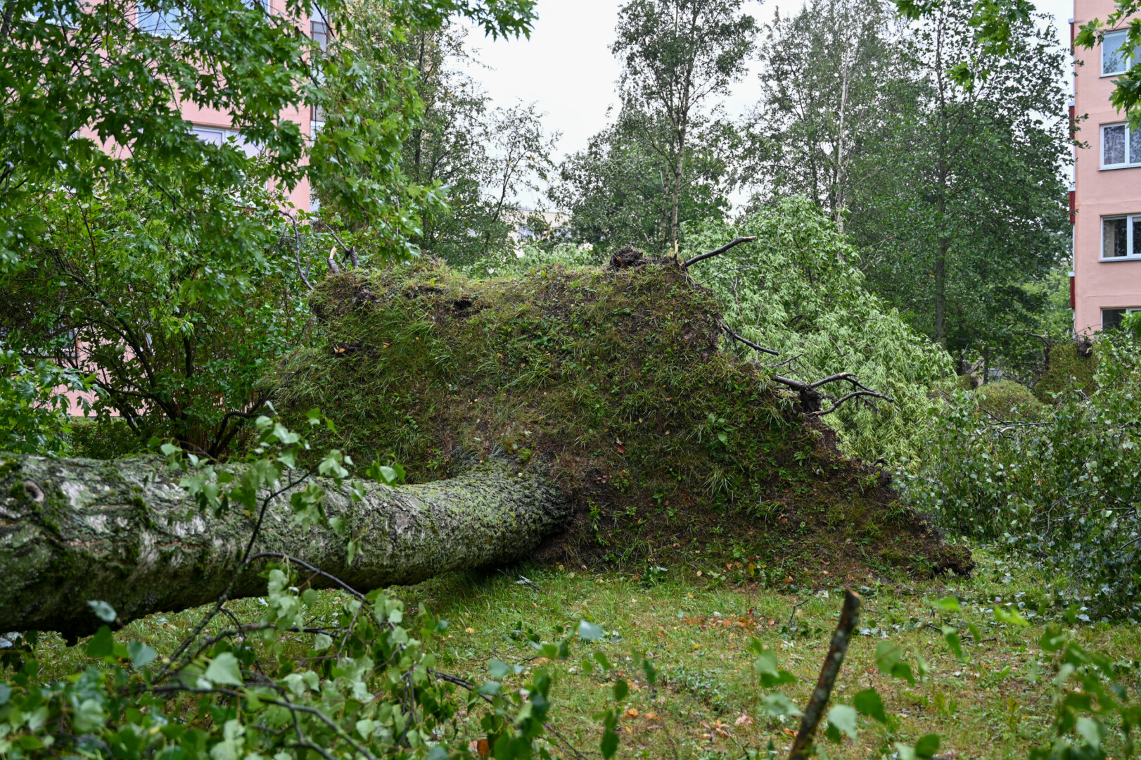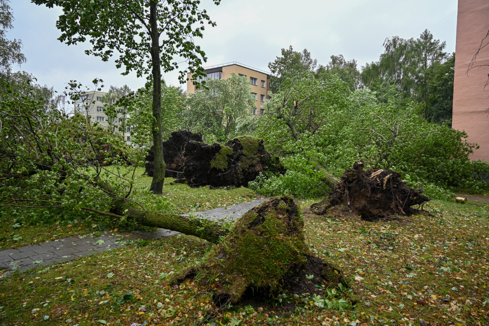 Panevėžyje vėjas ne tik laužė, bet ir rovė medžius. Didžiulė eglė išversta Sietyno skvere, naktį Tulpių g. 16-ojo daugiabučio kieme su šaknimis išversti net keturi didžiuliai medžiai, tarp jų – ir už penkiaaukštį aukštesnis beržas.