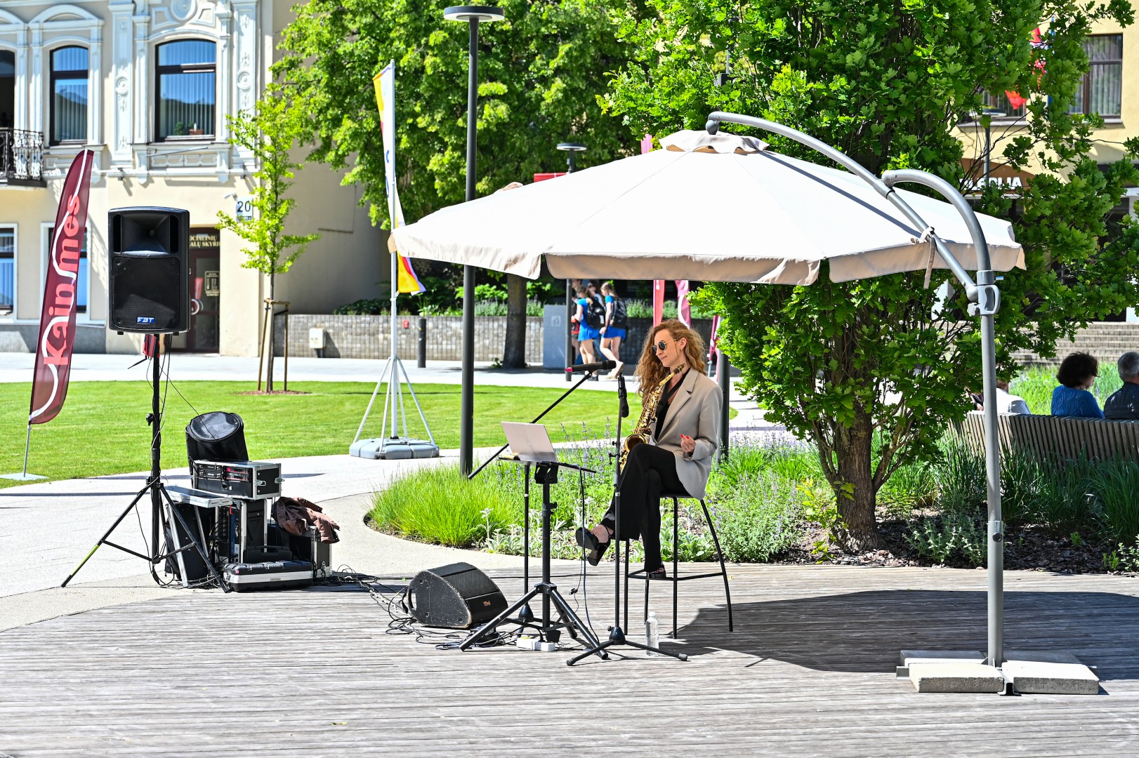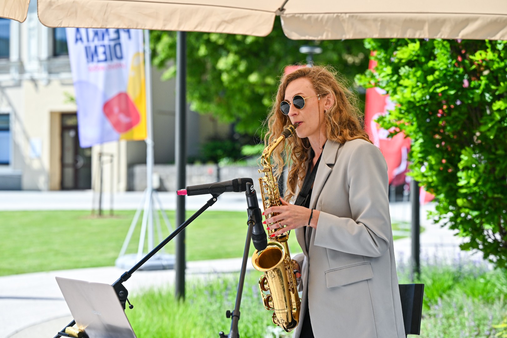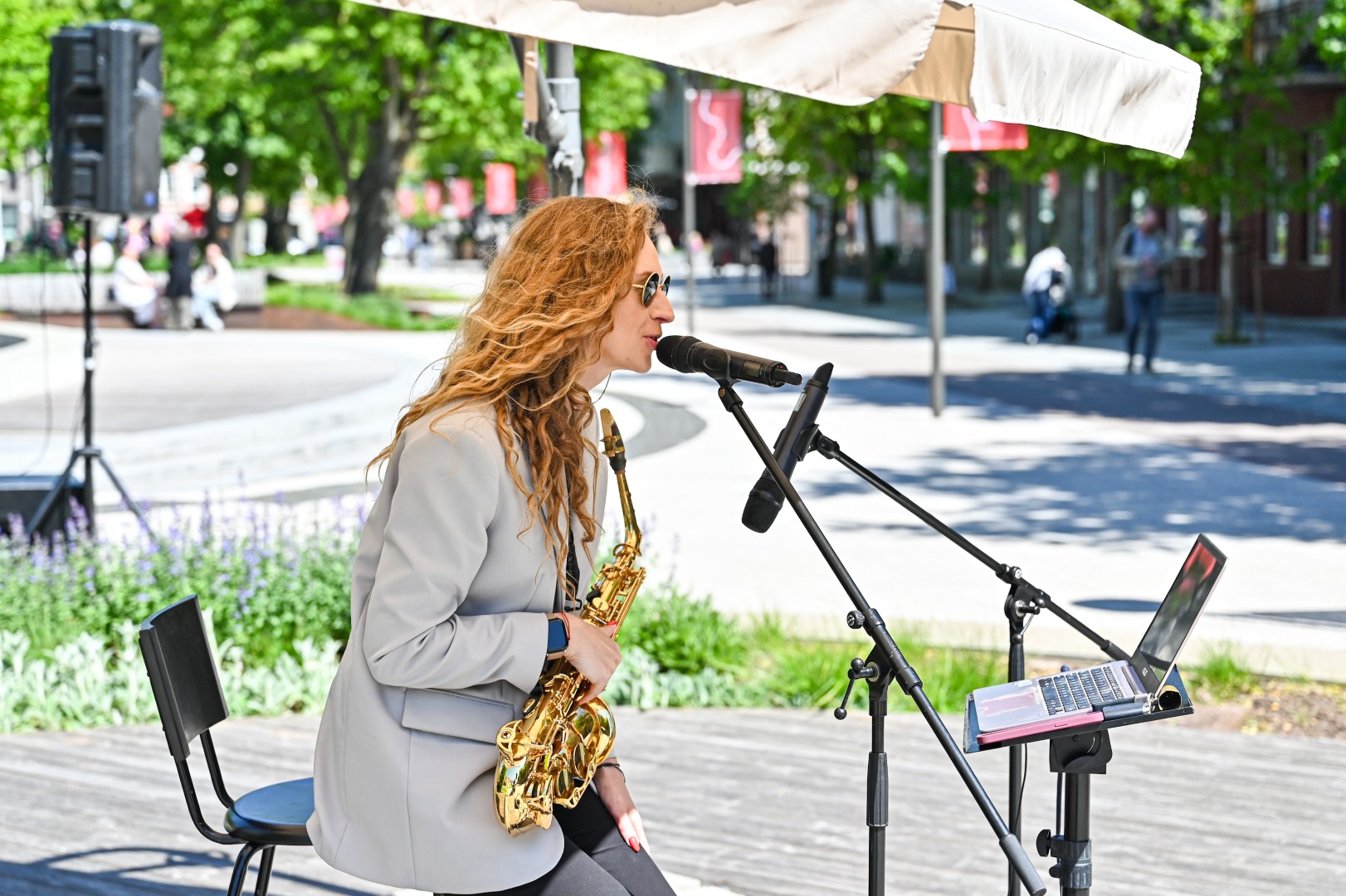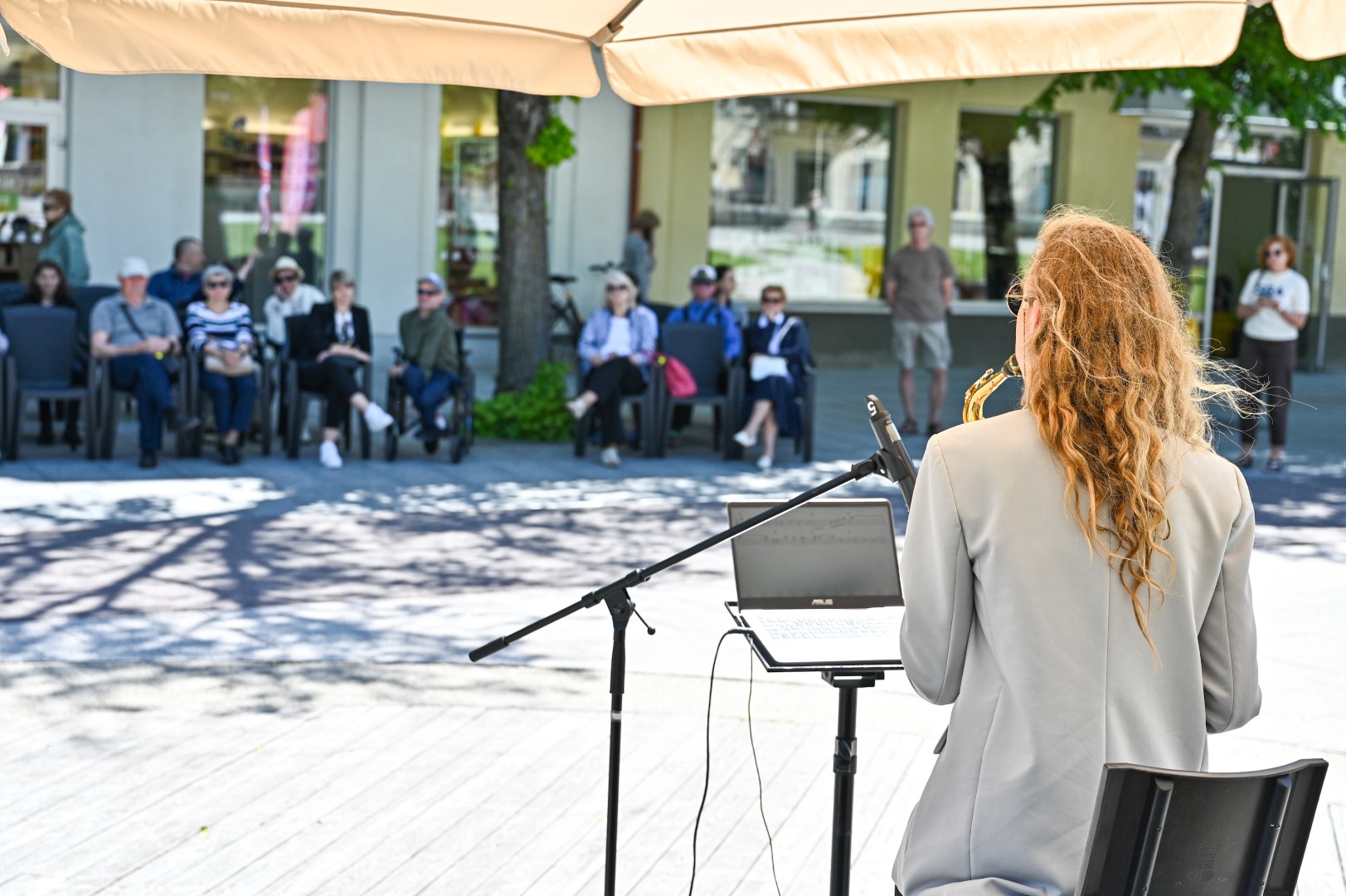O vidurdienį aikštėje suskambo saksofono garsai – praeiviams koncertavo Greta Karnatkaitė.