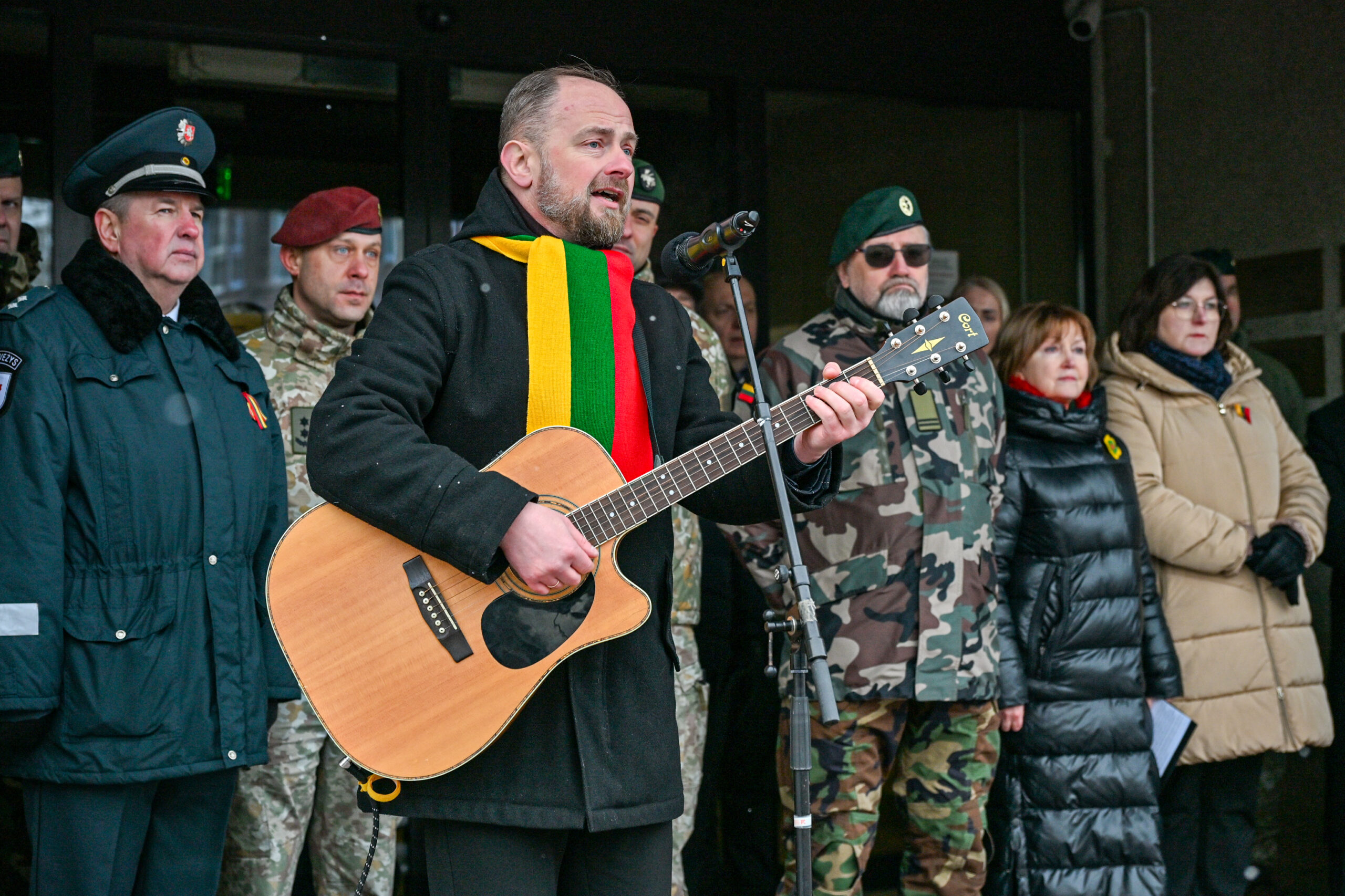 Iškilmingo minėjimo metu skambėjo Lietuvos himnas ir patriotiniai kūriniai, kuriuos atliko solistas Donatas Voveris.