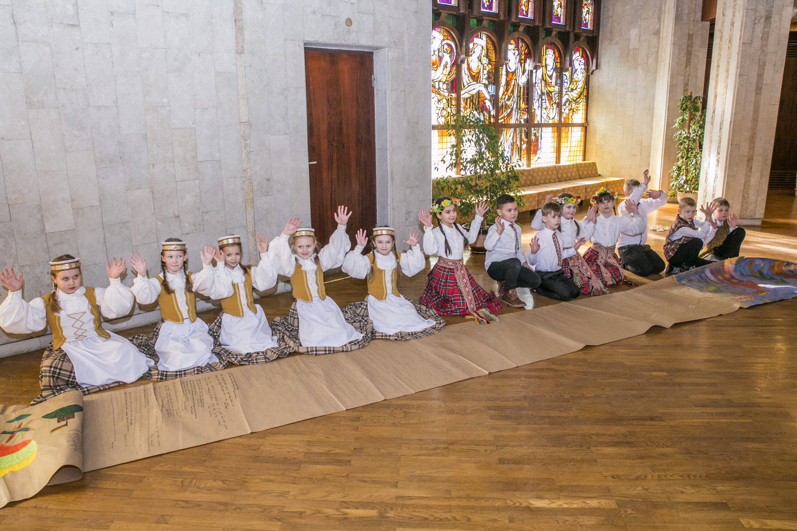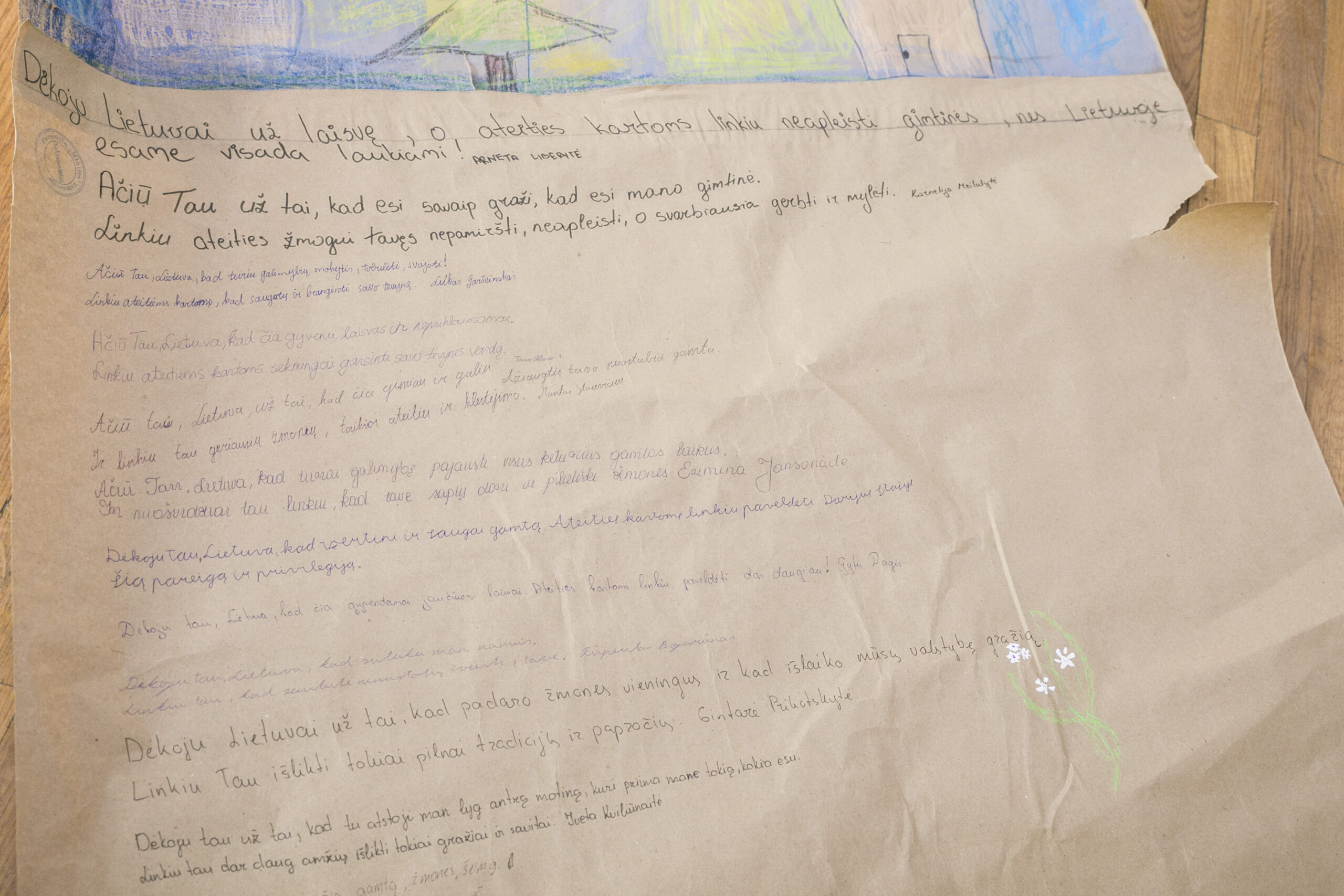 Apžiūrinėjant ilgąjį eksponatą į akis krinta vaikiška rašysena įamžinti prašymai. „Linkiu, kad nebebūtų karų“, „taikos“ – to vaikiškos širdelės trokšta per artėjantį šimtmetį. Drąsesnieji nori, kad „Lietuvoje būtų daug deimantų spalvotų“ ir linki šaliai būti turtingai.