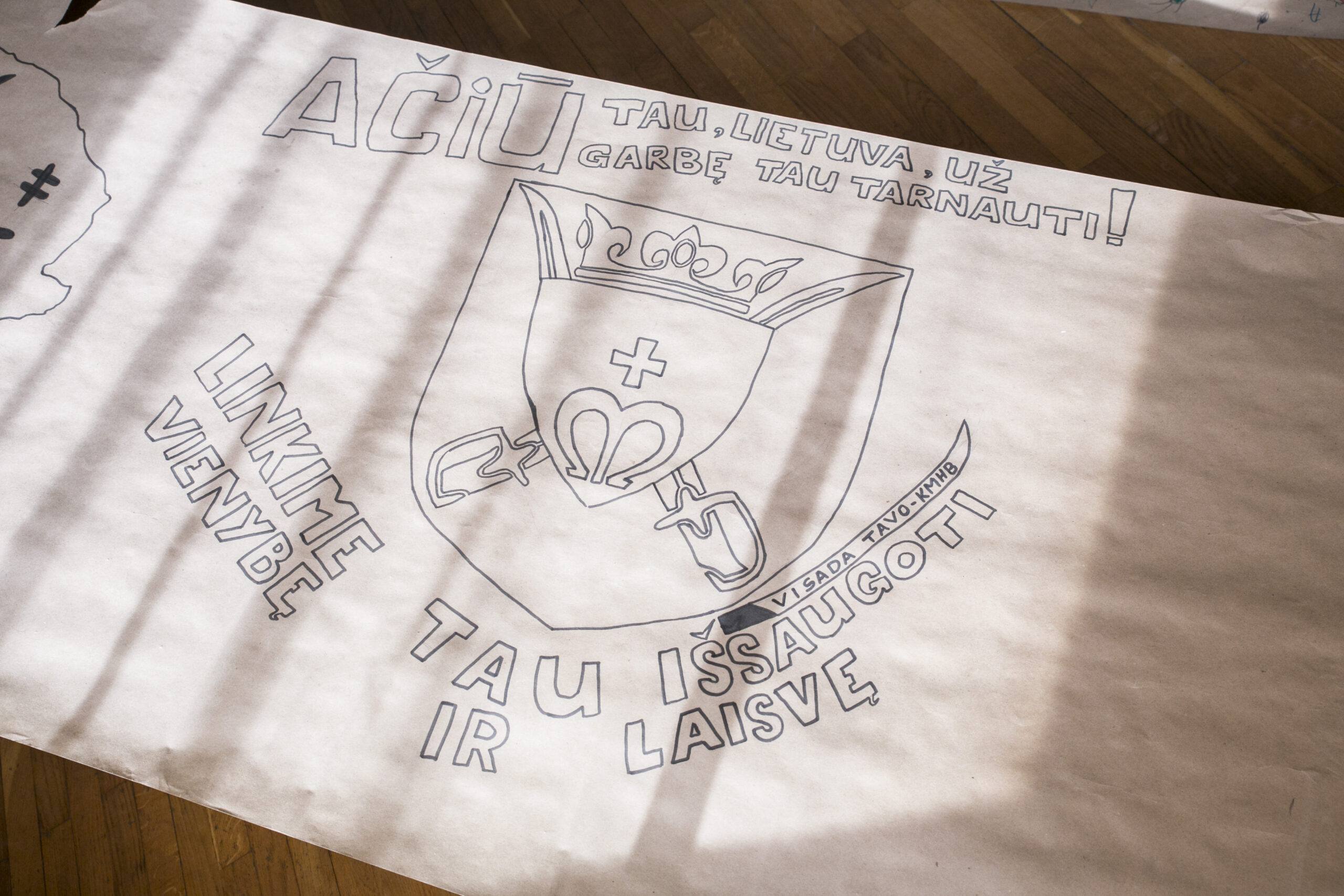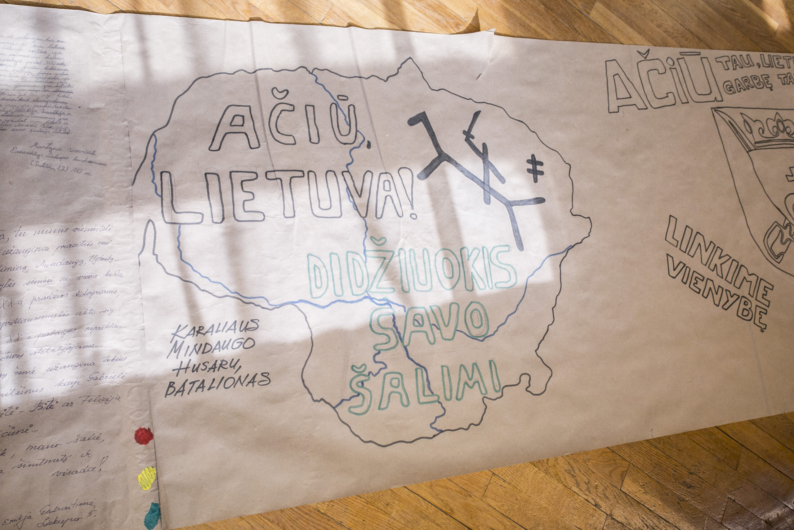 Tad nenuostabu, jog pergamento lakštuose – ne viena citata iš patriotiška dvasia persmelktų eilėraščių. Čia nugulė ir poeto Jono Aisčio eilės: „Atsikėlei graži ir džiaugsminga, Nors paplūdus kraujuos, bet laisva.“