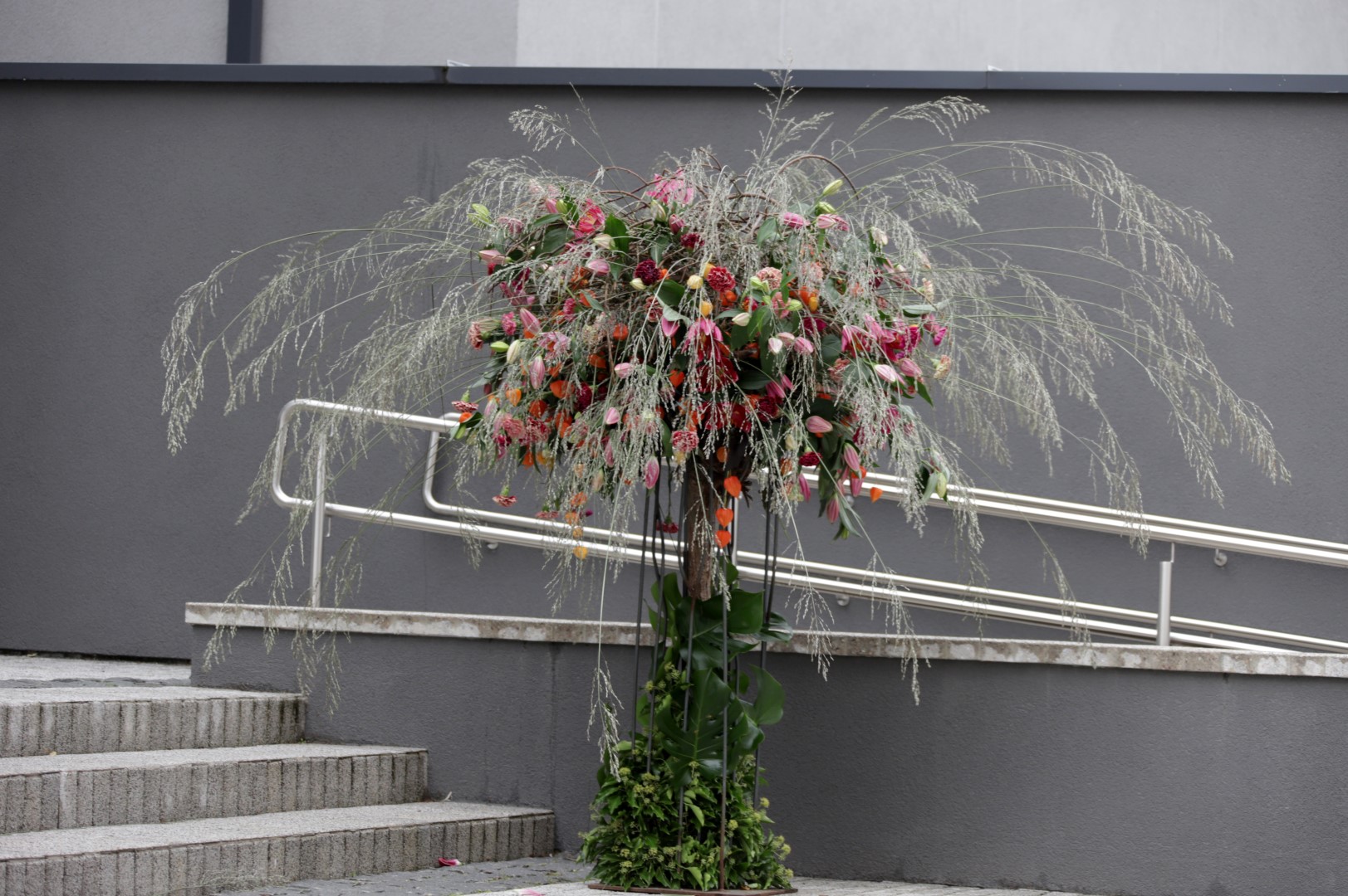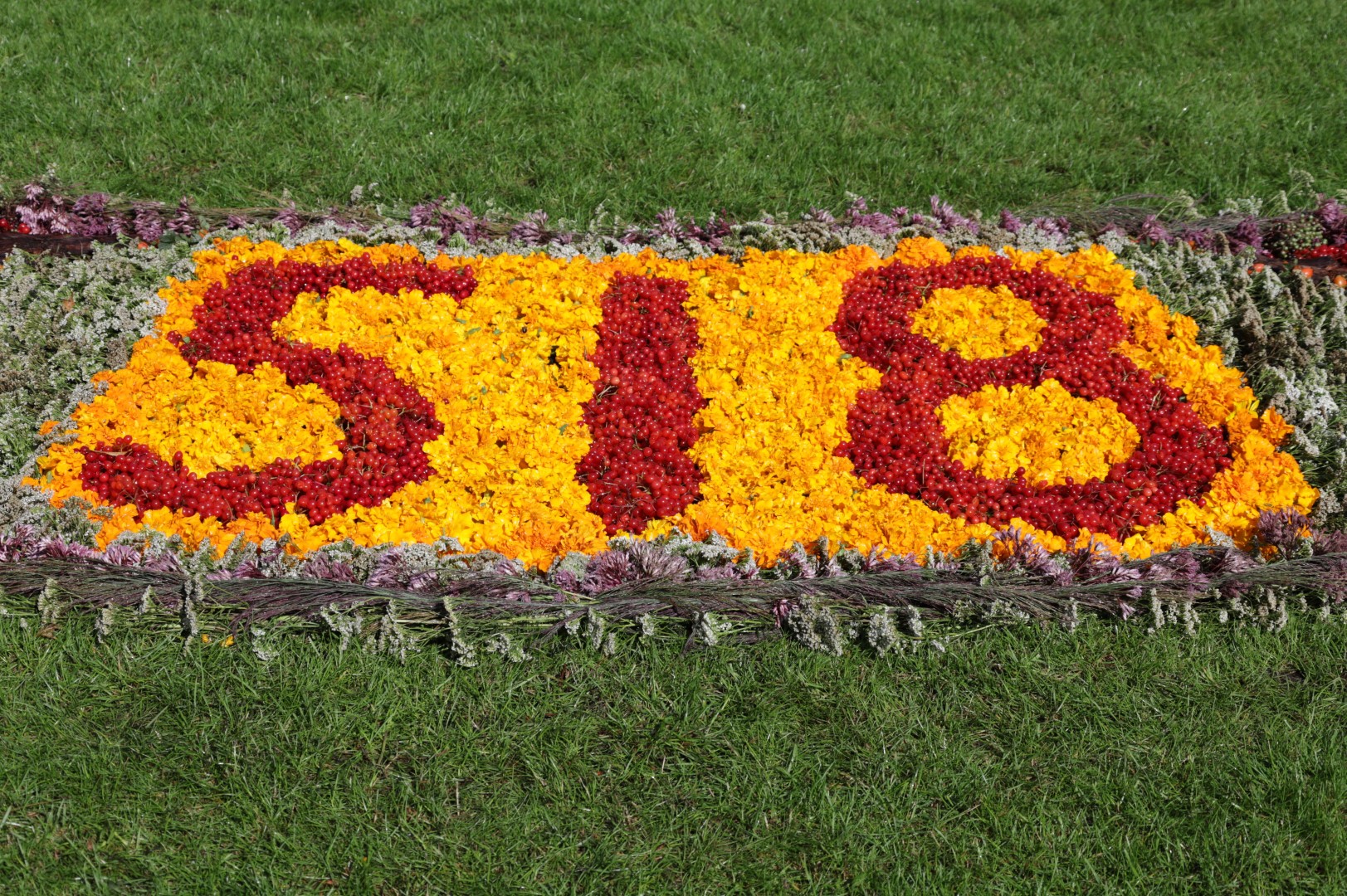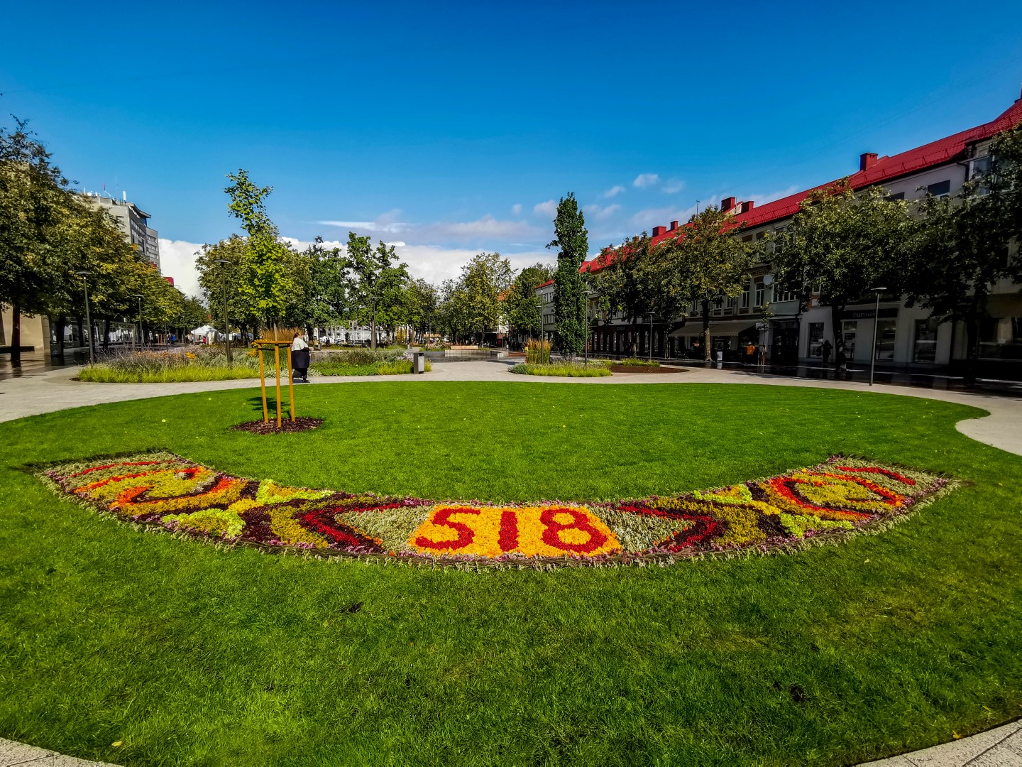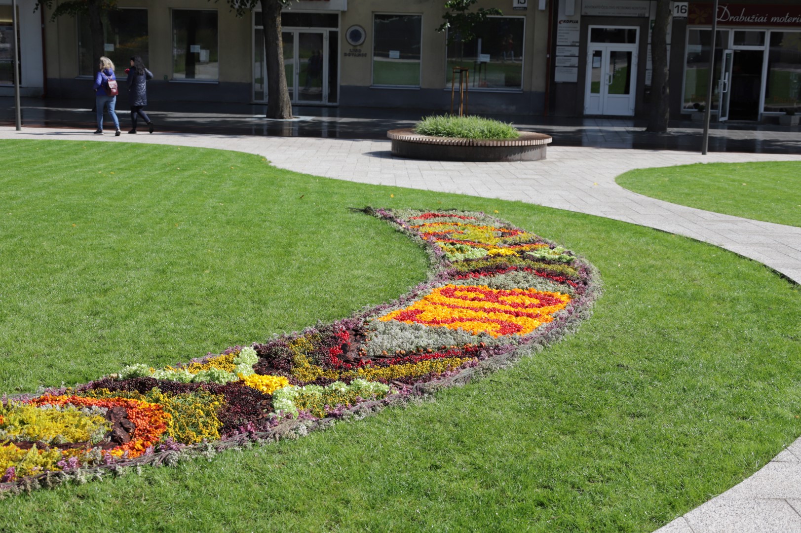 O prieš Savivaldybę ant vejos menininkai iš lauko žiedų ir žalumynų sukomponavo itin spalvingą tautinę juostą.