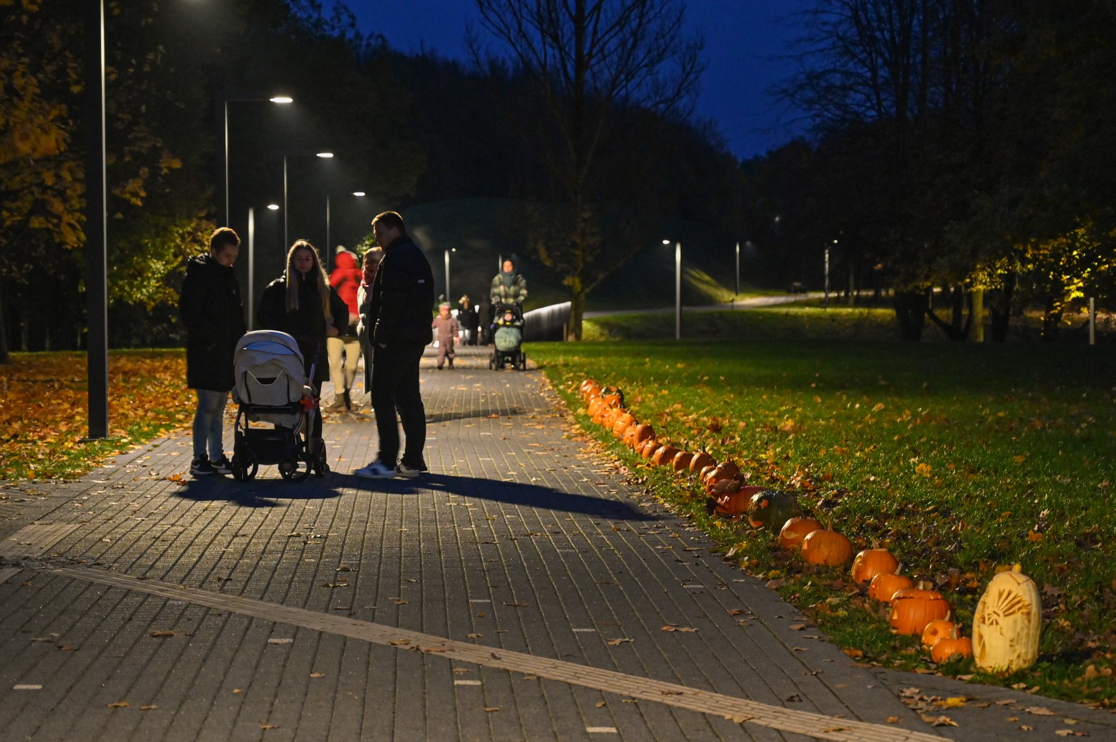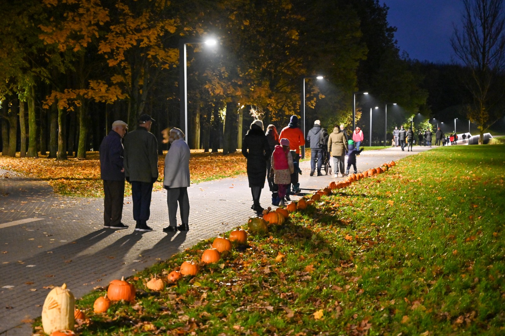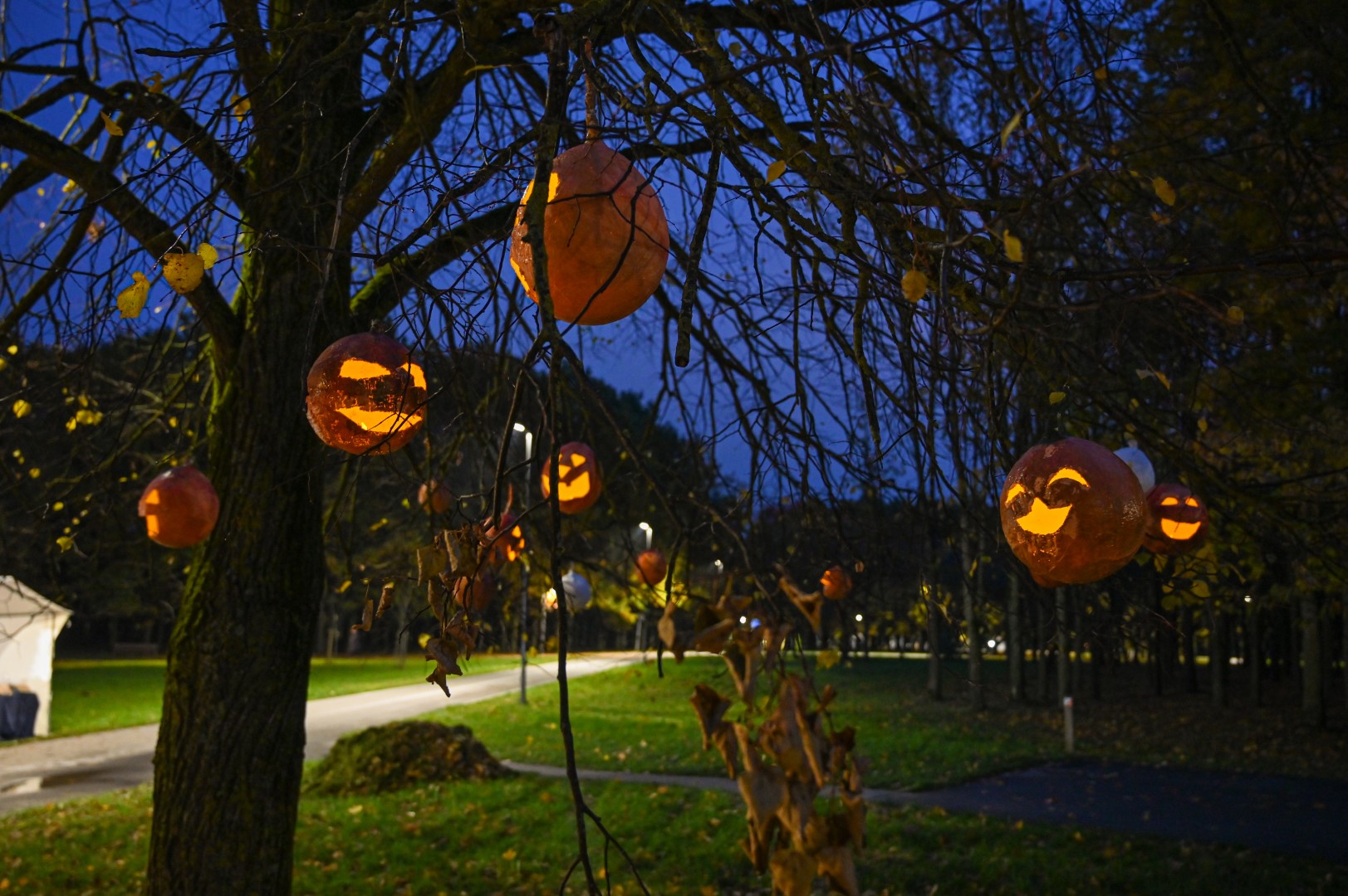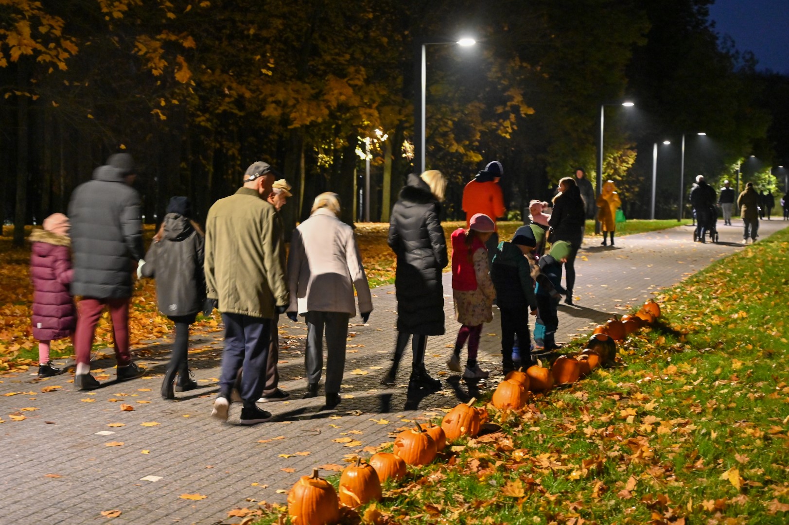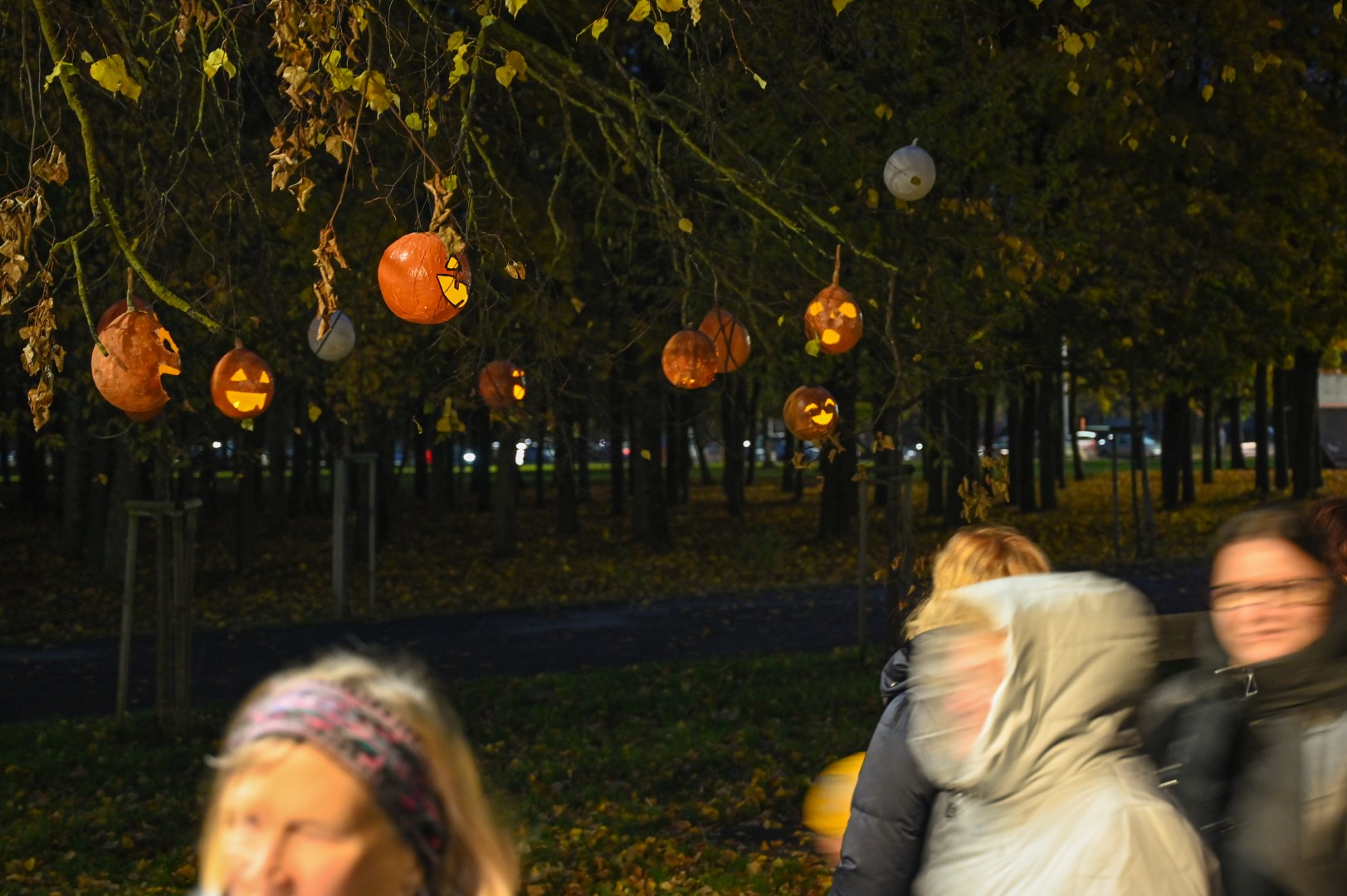 Sutemoms nusileidus į miestą, parko alėją nušvietė panevėžiečių išskaptuoti moliūgų žibintai.
