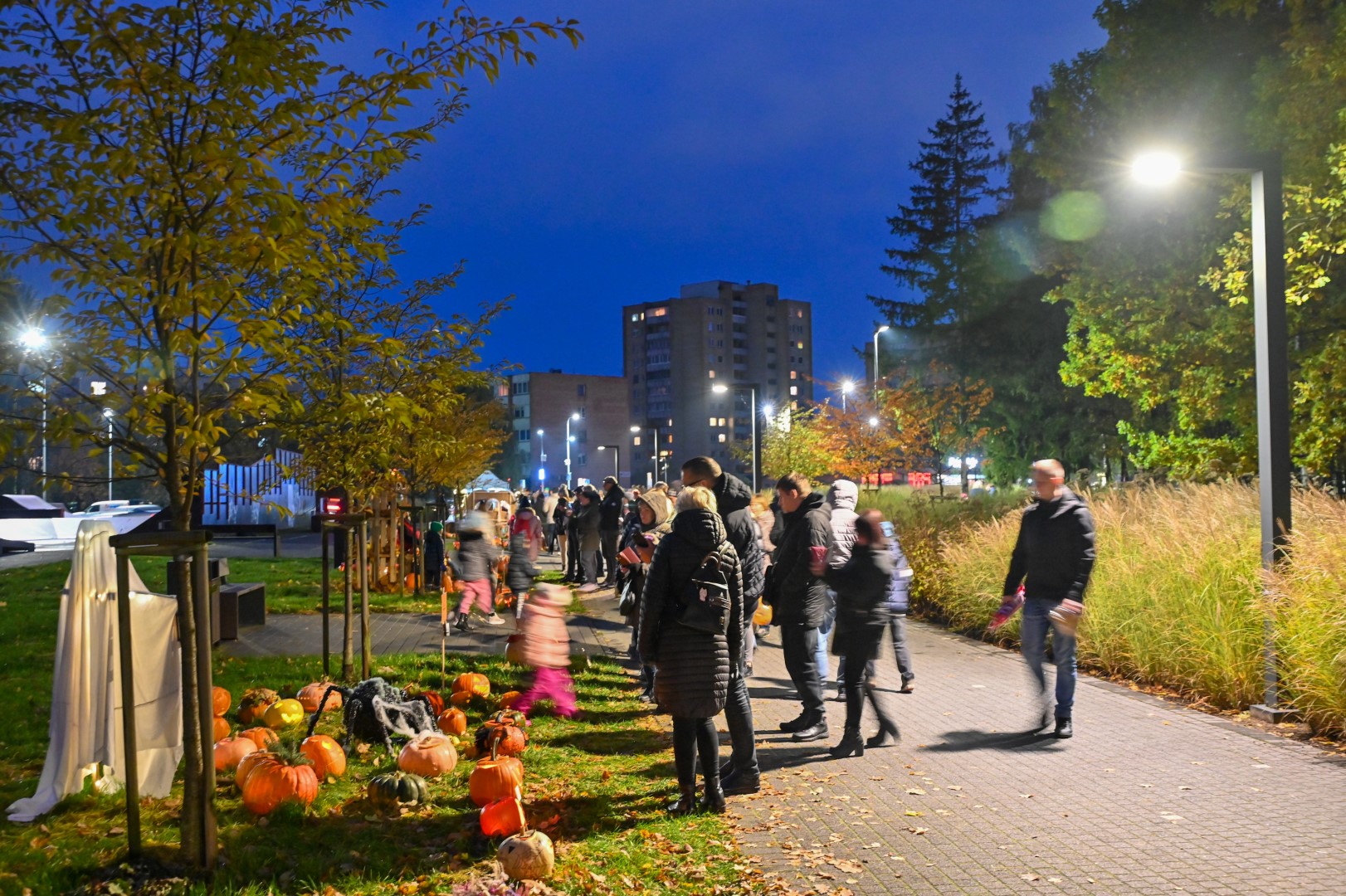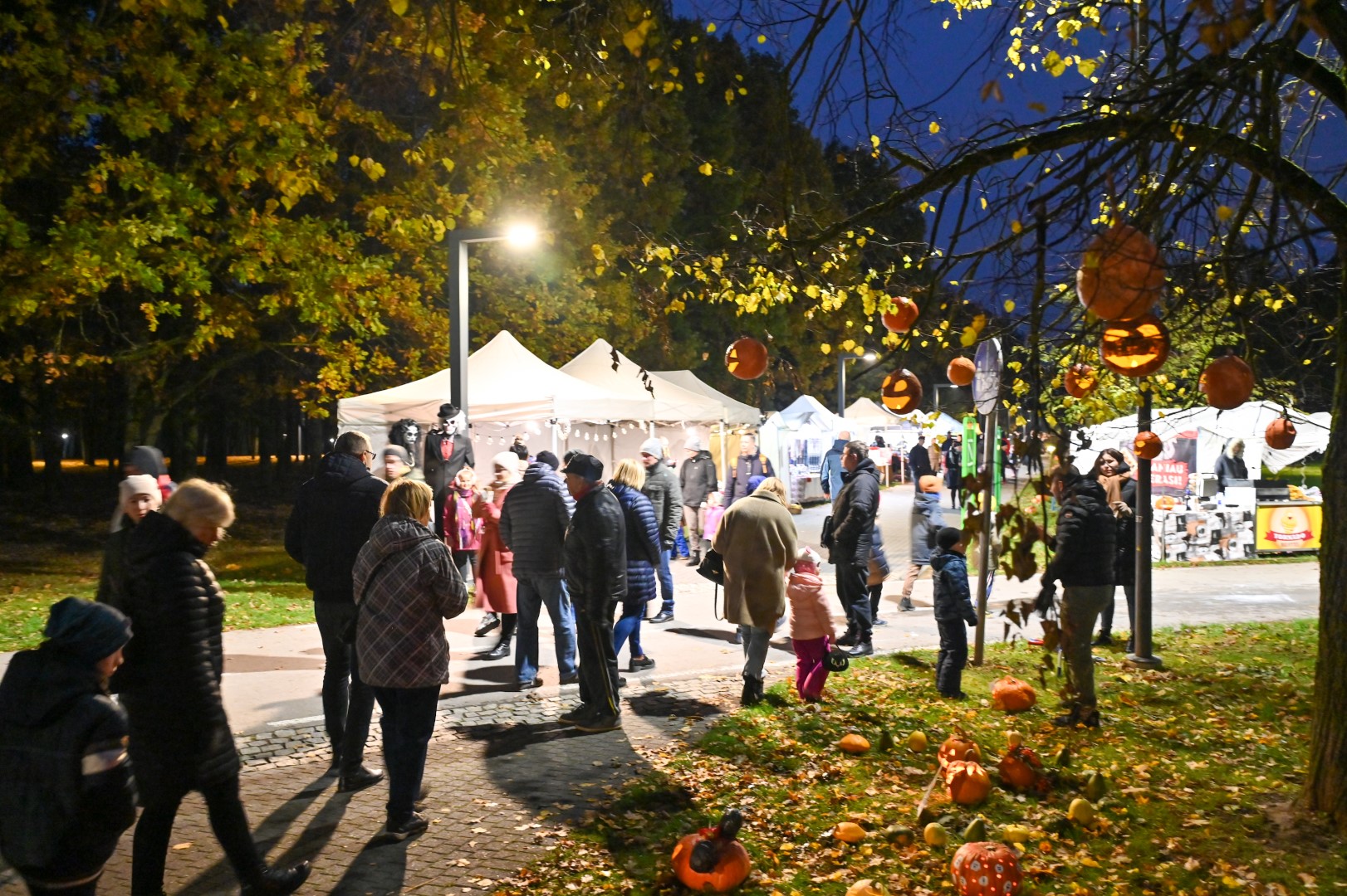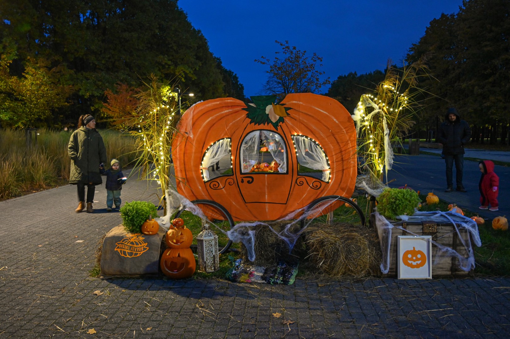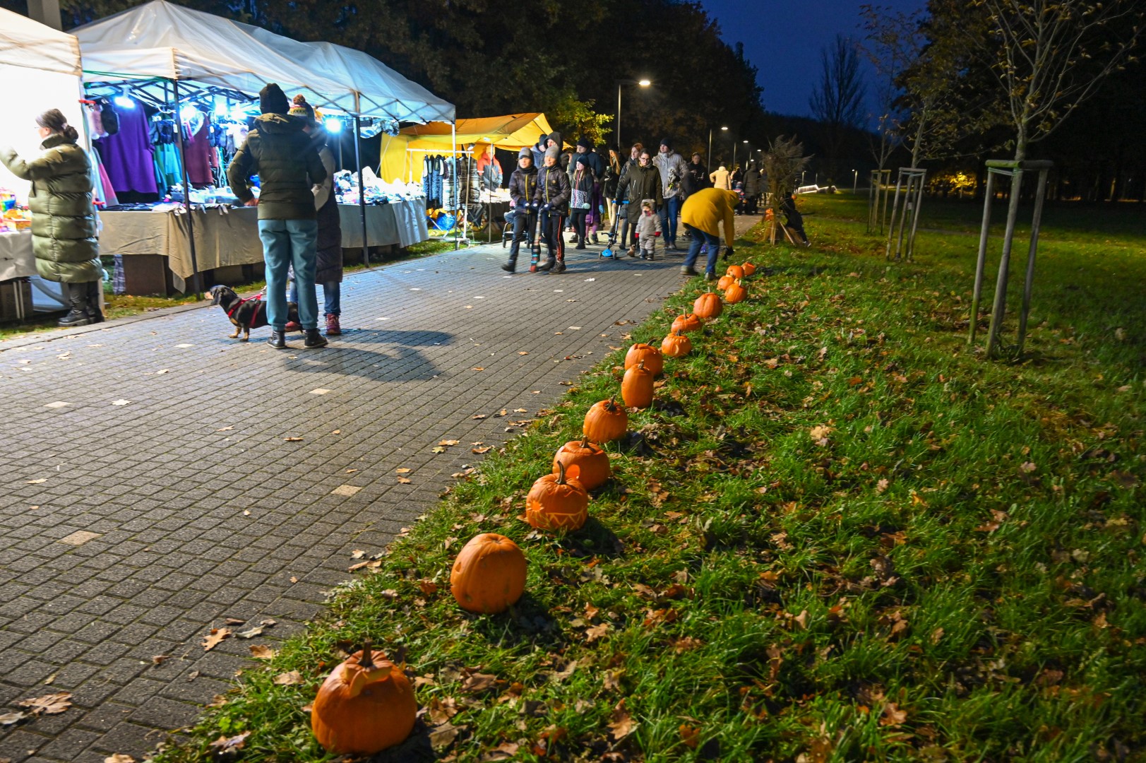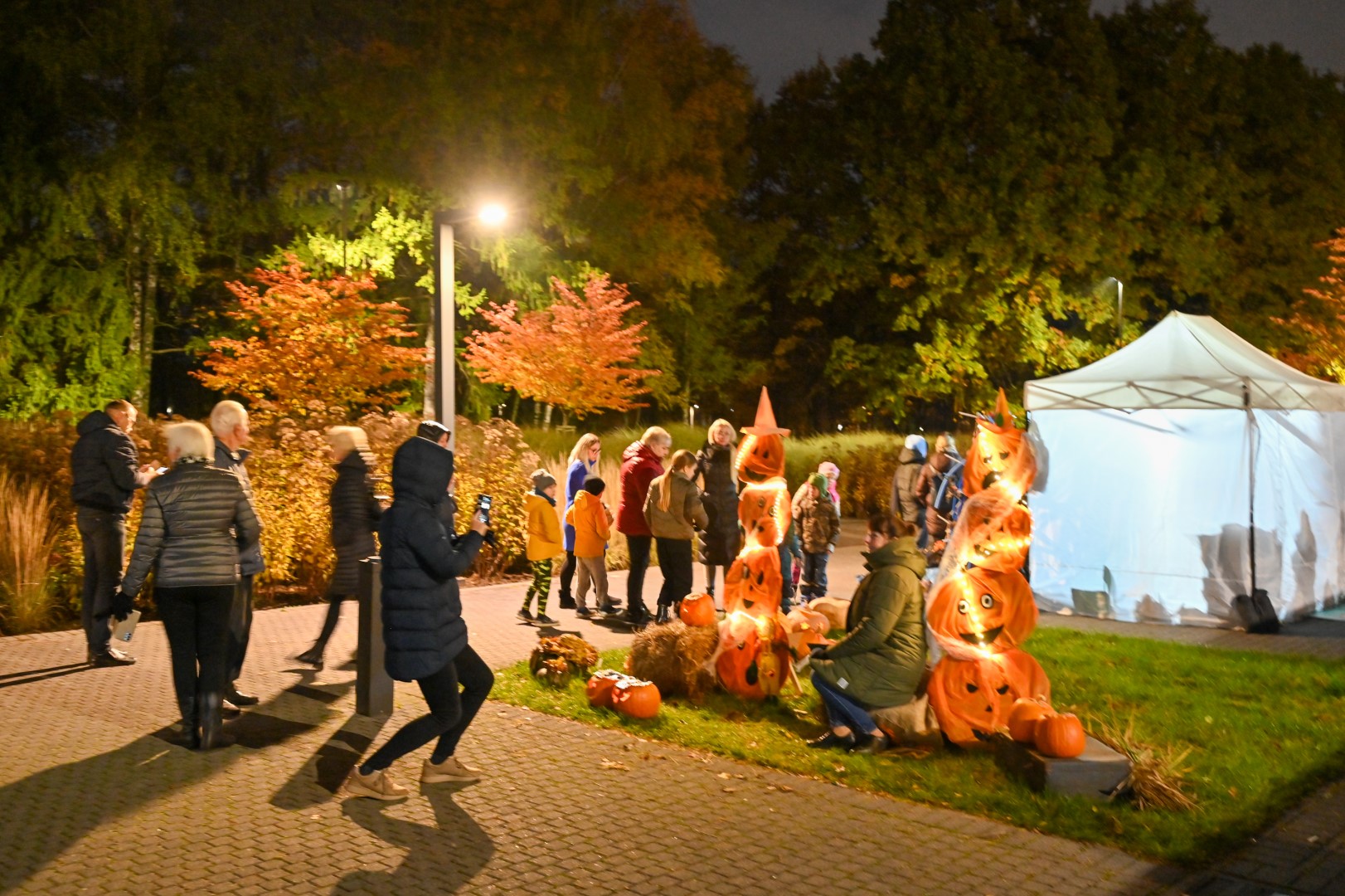 Sutemoms nusileidus į miestą, parko alėją nušvietė panevėžiečių išskaptuoti moliūgų žibintai.