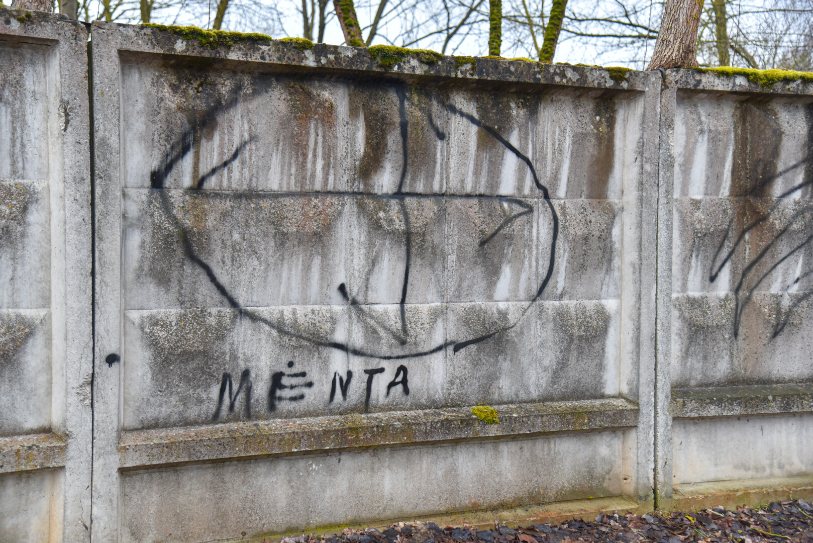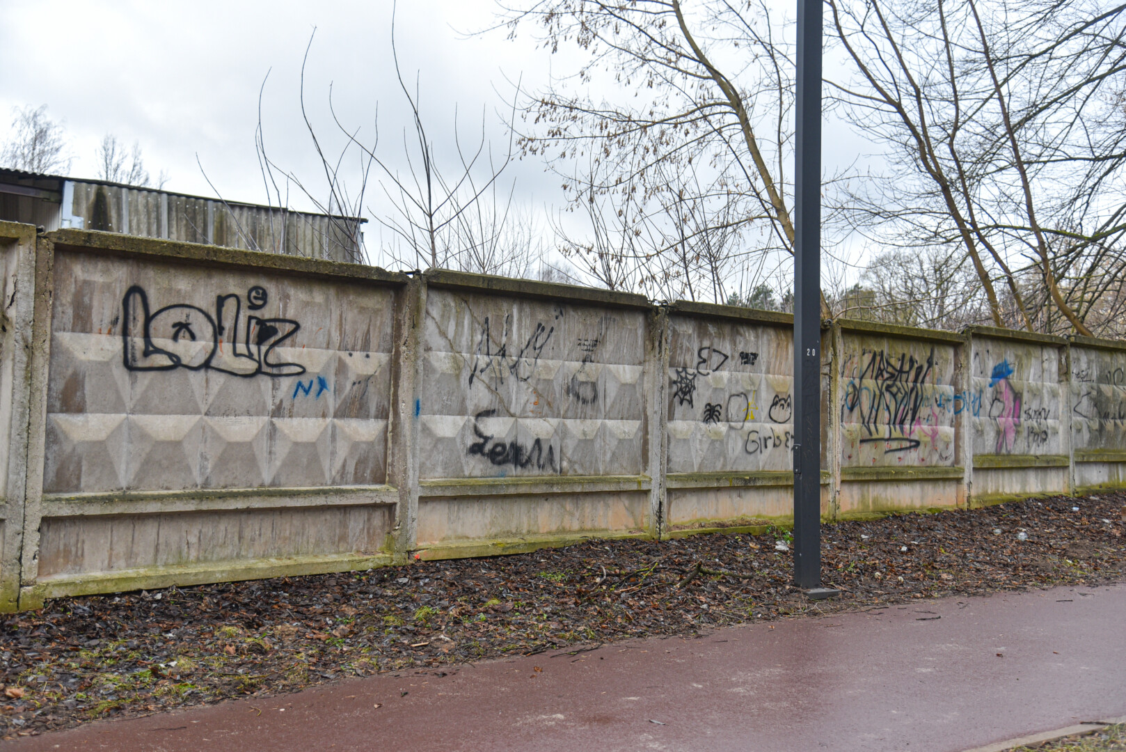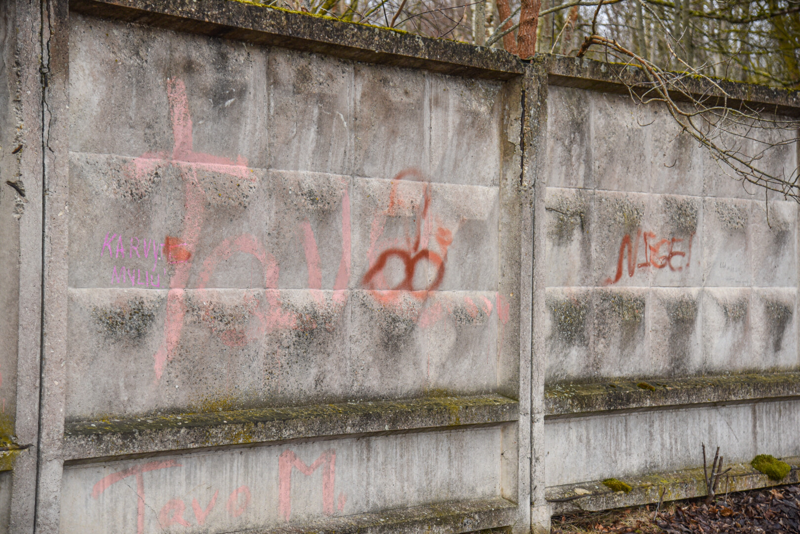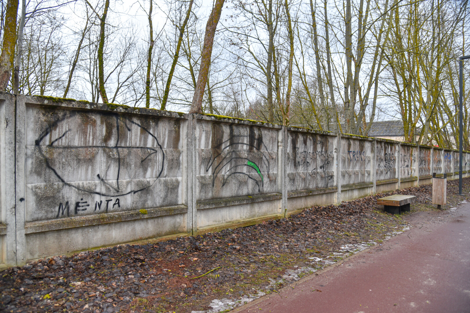 Savivaldybės prieš trejus metus iš panevėžiečio išpirkta ir nebaigta griauti tvarkomo Skaistakalnio parko gelžbetoninė tvora virto savotiška piešimo lenta necenzūrinių teplionių gerbėjams.