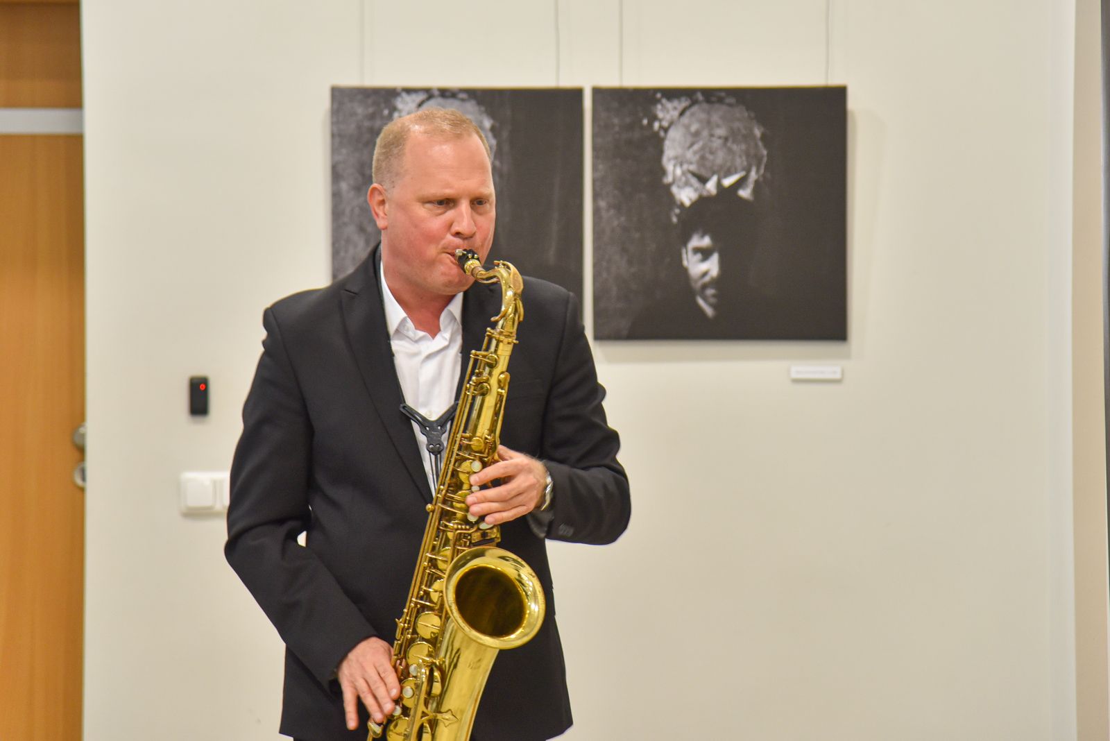 Ji paprašė A. Viduolį atsinešti instrumentą, kuriuo groja. Su saksofonu rankose muzikantas turėjo praeiti pro M. Čičirkienės ir jos sūnaus eksponuojamą bendrą kūrinį. M. Čičirkienė tuo metu jį fotografavo ir taip gimė puiki nuotrauka.