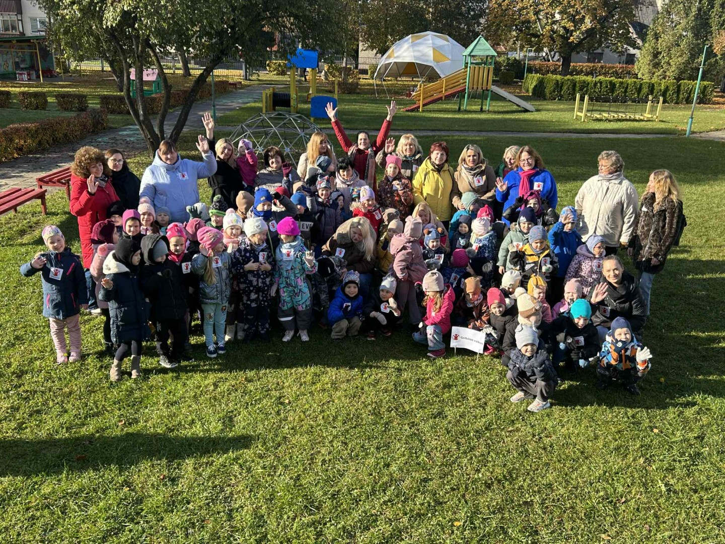 Vaikai, pedagogai, tėveliai – daugiau nei 100 bėgikų – saulėtą pirmadienį smagiai ir draugiškai nubėgo 500 metrų ratą aplink darželį, taip padidindami visos Lietuvos švietimo įstaigų renkamus solidarumo kilometrus ir prisidėdami prie kilnios misijos – ištiesti pagalbos ranką su sunkumais susiduriantiems vaikams.