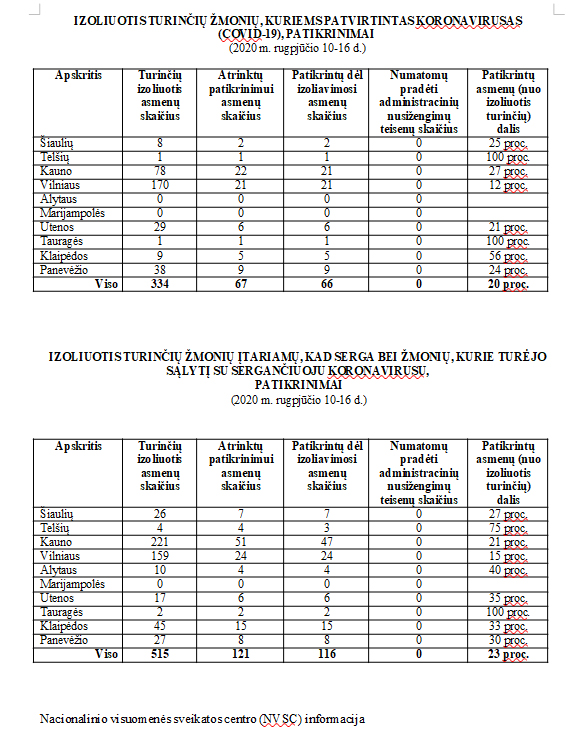 Tai parodė atsitiktinės atrankos būdu per savaitę, rugpjūčio 10–14 d., Nacionaliniam visuomenės sveikatos centrui (NVSC) patikrinus 182 gyventojus iš 849, kurie privalėjo laikytis saviizoliacijos. Tokie tikrinimai pradėti sveikatos apsaugos ministro Aurelijaus Verygos sprendimu, reaguojant į gyventojų nuogąstavimus, kad gali būti atvejų, kai nesilaikoma būtinos izoliacijos.