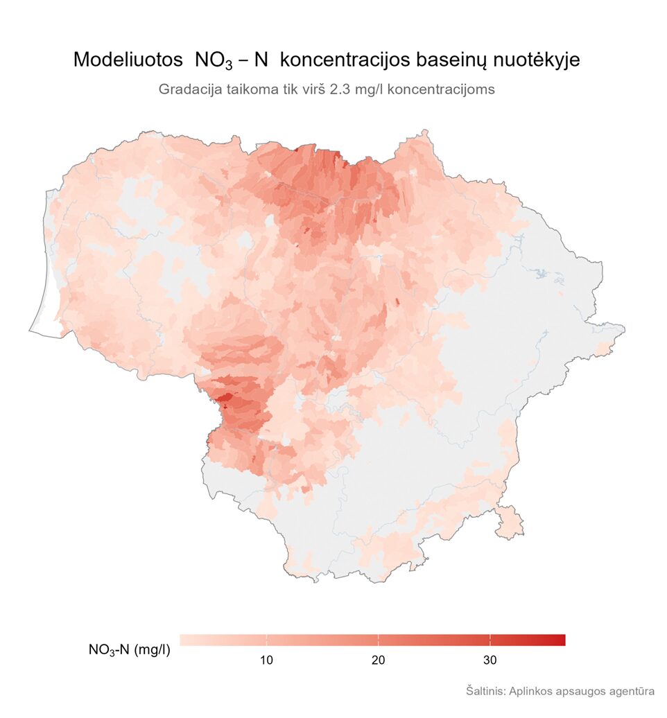 Vandens kokybės modeliavimo duomenys patvirtino, kad didžiausios nitratinio azoto (sudaro pagrindinę bendro azoto dalį) koncentracijos paviršiniame į upes patenkančiame vandens nuotėkyje susidaro būtent intensyvios augalininkystės teritorijose, esančiose Vidurio ir Šiaurės Lietuvoje.
