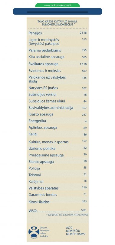 Laisvosios rinkos institutas (LLRI) apskaičiavo, jog už vidutinį atlyginimą – 693 eurus į rankas – dirbantis žmogus per 2018 metus sumokės sumą, kurią pačiam susitaupyti būtų tiesiog neįmanoma. Taigi, jei esate tiek uždirbantis statistinis Lietuvos darbuotojas, metų gale būsite valstybei sumokėjęs 7 281 eurą. Kitaip tariant, po 5–6 metų „Volkswagen Passat“ kasmet arba po nesuremontuotą butą Panevėžyje kas porą trejetą metų.