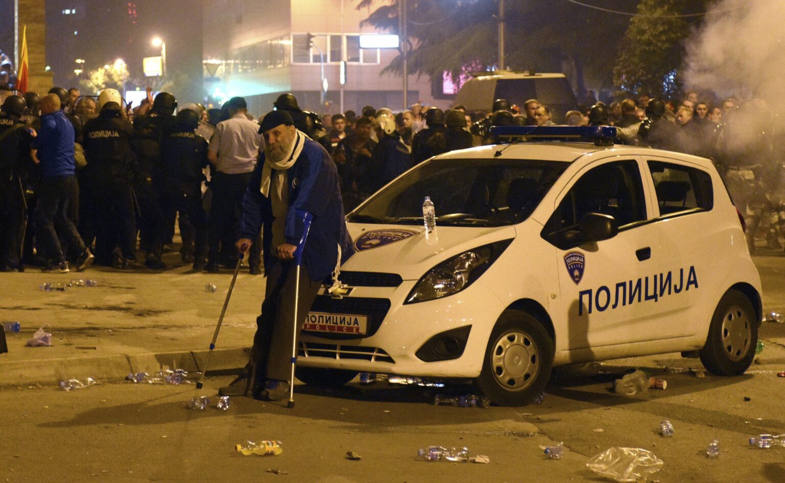 Ketvirtadienio vakarą sostinės Skopjės centre kilo didelė sumaištis: dešimtys demonstrantų, tarp kurių buvo grupė kaukėtų vyrų, prasiveržė per parlamentą apsupusius policininkus ir įžengė į pastatą, kur mojavo Makedonijos vėliavomis, šūkavo ir giedojo nacionalinį himną.