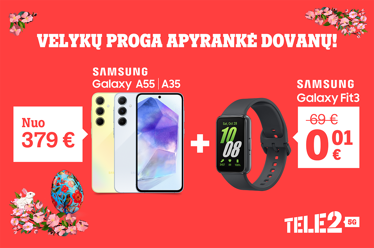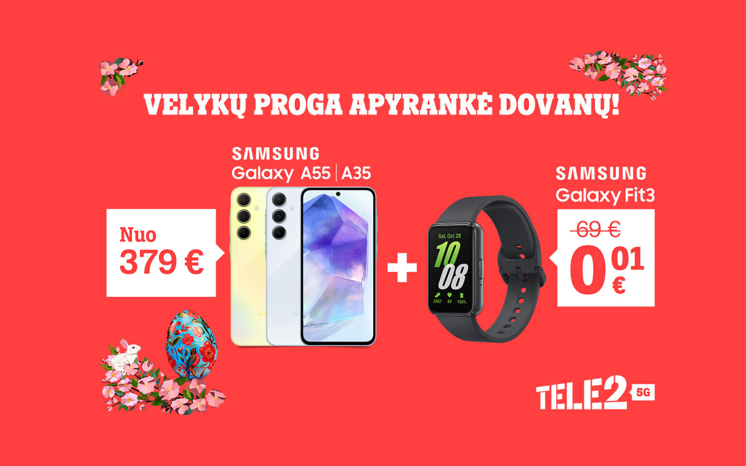 Staigmenų sulauks ir tie, kurie iki Velykų su 24 mėn. sutartimi įsigis išmanųjį telefoną „Samsung Galaxy A55 5G“ arba „Samsung Galaxy A35 5G“. perkant vieną iš šių įrenginių, už 1 centą bus galima įsigyti išmaniąją apyrankę „Samsung Galaxy Fit 3“ (vertė – 69 Eur). Ši apyrankė vienu įkrovimu veikia net iki 13 dienų. Prietaisas matuoja jūsų fizinio aktyvumo rezultatus, širdies ritmą, miego kokybę. Be to, apyrankė turi muzikos grojimo funkciją, leidžia atsiliepti skambučius ir siųsti žinutes.
