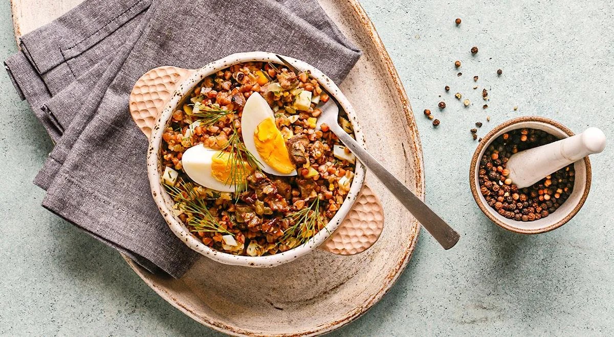 Reikės (6 porcijoms): 450 g viščiukų širdelių, 1,5 stiklinės grikių, 4 virtų kiaušinių, 1 didelio svogūno, 150 g sviesto.