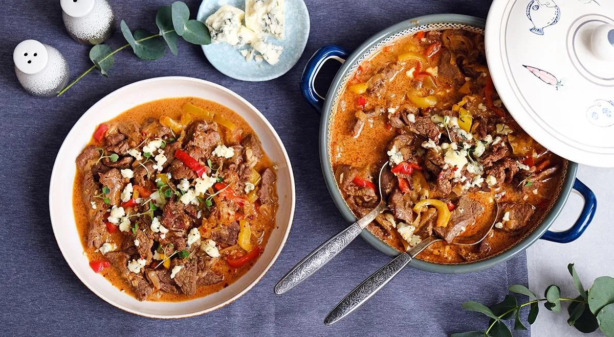 Reikės (4 porcijoms): 400 g jautienos, 1 geltonos paprikos, 1 raudonos paprikos, 1 svogūno, 3–4 česnako skiltelių, 120 g grietinės, 1 šaukšto pomidorų pastos, 4 šaukštų aliejaus, 150 g mėlynojo pelėsio sūrio, druskos, šviežiai maltų juodųjų pipirų.