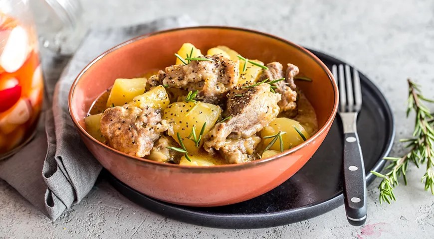 Reikės (4–6 porcijoms): 600 g kiaulienos kumpio be kaulo, 600 g bulvių, 400 g svogūnų, 40 ml aliejaus, 2 šaukštų miltų, 1 šaukšto paprikos miltelių, 2 rozmarino šakelių, druskos, šviežiai maltų juodųjų pipirų.