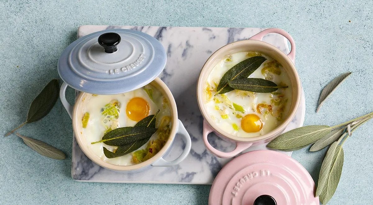 Sustatę ant gilios kepimo formos, į šią pripilkite karšto vandens tiek, kad apsemtų puodynes iki pusės. Į kiekvieną jų įmuškite po kiaušinį.