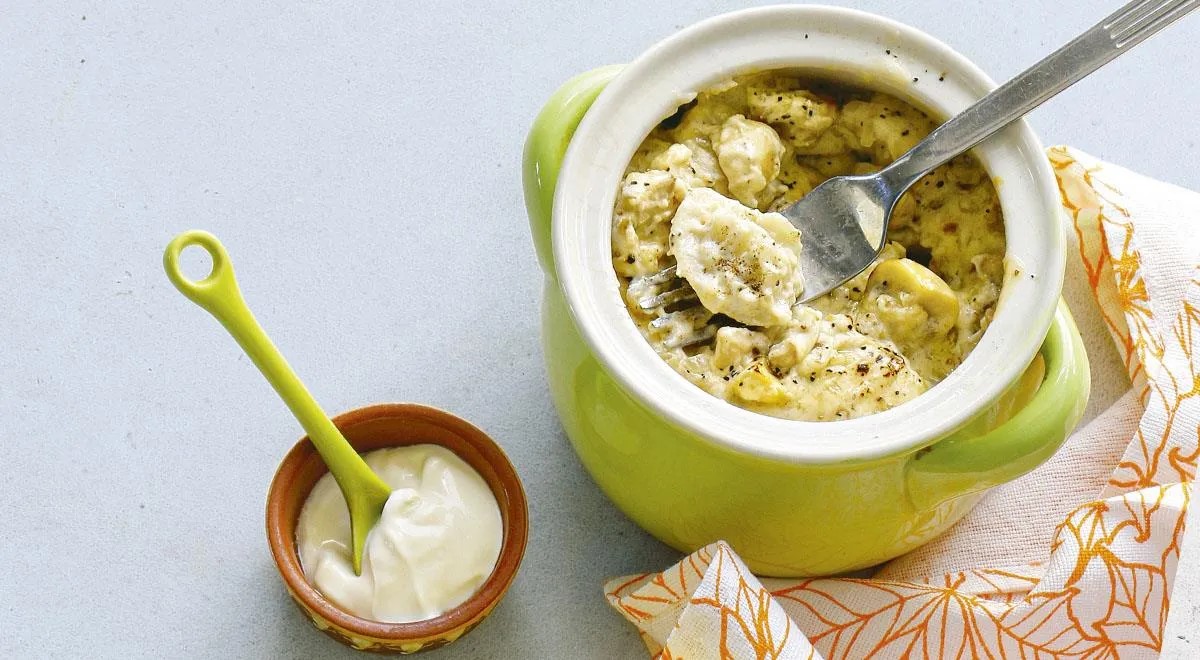Reikės (4 porcijoms): 400 g bulvių, 250 g kiaulienos išpjovos, 150 g pievagrybių, 80 g svogūnų, 2 česnako skiltelių, 1 kiaušinio, 25 g miltų, 300 g grietinės (18 proc.), 250 ml grietinėlės (10 proc.), 100 g kietojo sūrio, aliejaus, druskos, maltų juodųjų pipirų.