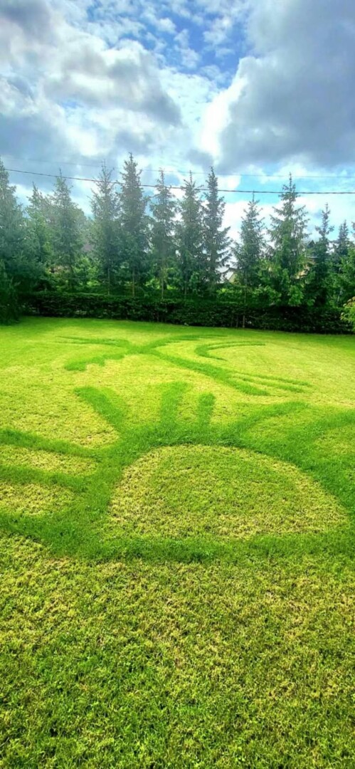 Dar visai neseniai nupjautą pievą puošė gėlės ornamentas, o Motinos dienai vejoje atsirado ir originalus menininko sveikinimas brangiausiam žmogui.