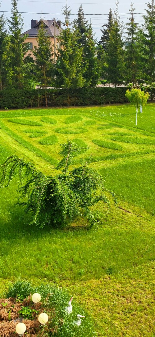Dar visai neseniai nupjautą pievą puošė gėlės ornamentas, o Motinos dienai vejoje atsirado ir originalus menininko sveikinimas brangiausiam žmogui.